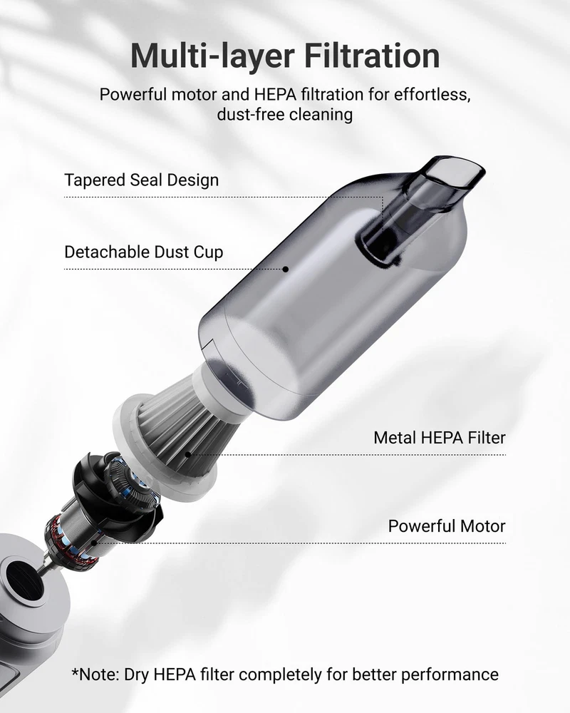 Powerful Motor for Deep Clean: The Handheld Vacuum Cordless boasts 12,000Pa strong suction and 75,000rpm brushless motor for efficient cleaning. Clean your car or home in just one go effortlessly with its powerful performance. Lightweight and Portable: The Small Vacuum Cleaner Cordless is super lightweight at only 0.8lb and compact in size, making it easy to clean tight spaces without tiring your hands. The portable vacuum allows you to keep your car and home clean and tidy anywhere you go. Cordless and Ergonomic: The Cordless Handheld Vacuum's ergonomic and wireless design allows for easy maneuvering, comfortable extended use, and hassle-free cleaning, without being tethered to a power outlet so you can use the vacuum anywhere. Versatile 4-in-1 Design: The Handheld Vacuum Cordless with its 4-in-1 function makes cleaning and organizing a breeze. It's perfect for removing dust, cleaning keyboards, inflating outdoor gear, and extracting air from storage bags, anytime and anywhere. Long-Lasting Rechargeable Battery: Clean your car and home anytime with Vacuum Cordless Rechargeable. 26 minutes of uninterrupted cleaning time, up to 90 days standby time and USB-C charging ensures long-lasting power. 4-Layer Filtration: Clean effortlessly with the portable vacuum cordless. Its separated structure, detachable dust cup, powerful motor, HEPA filtration, and tapered seal design captures 99.7%* of dust and debris while preventing garbage leakage. (Note: The washable HEPA filter should be dried completely before reusing for optimal performance.)