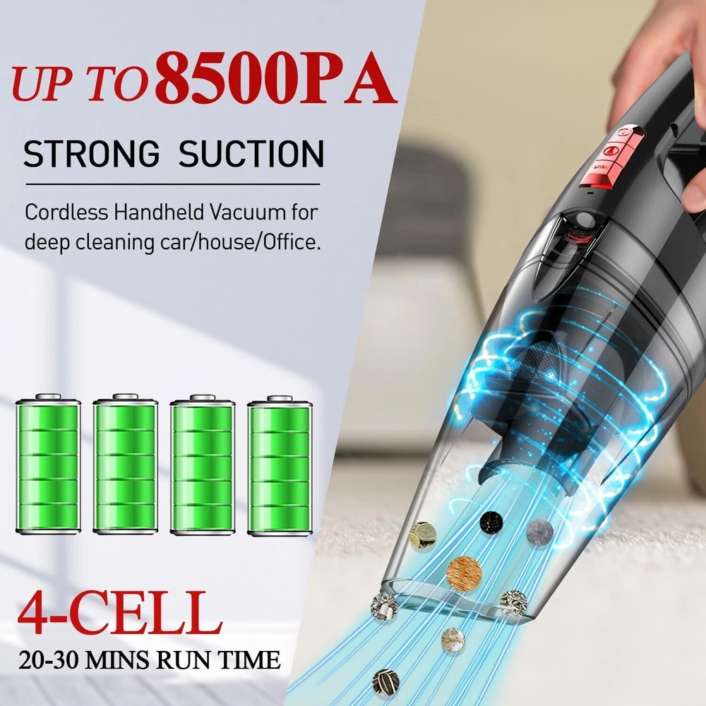 Special Feature UP TO 8500 PA Suction Power Vacuum; Wet/Dry Hand Vacuum Cleaner; LED Light Hand Held Vacuum; Wall-Mounted Charging Hand Vacuum; Low Frequencies below 73dB UP TO 8500 PA Suction Power Vacuum; Wet/Dry Hand Vacuum Cleaner; LED Light Hand Held Vacuum; Wall-Mounted Charging Hand Vacuum Filter Type Cloth Included Components Crevice Nozzle*1,Hair Brush*1,Water Absorption Nozzle*1,Filter*2, Adapter*1 Is Cordless? Yes Surface Recommendation Crevice Nozzle brush: For cleaning car, sofa gaps, curtains, keyboards, carpets, floors, etc. Hair Brush: For cleaning beds, curtains, tables, chairs, and other furniture with fabric surfaces. Water Absorption Nozzle brush: For cleaning liquid. Crevice Nozzle brush: For cleaning car, sofa gaps, curtains, keyboards, carpets Power Source Battery Powered Voltage 14.8 Volts Wattage 80 watts About this item 【UP TO 8500 PA Suction】Handheld cordless vacuum has powerful suction up to 8500PA. It can provide two modes according to different needs, 6500pa and 8500pa. It has a very good cleaning effect on dust, paper scraps, particles and pet hair. Cord-free design and lightweight and small comfortable size and easily carried and suitable for various occasions such as home, office, car, etc. 【Wet Dry Handheld Vacuum】Handheld vacuum cleaner has Crevice Nozzle*1, Hair Brush*1, Water Absorption Nozzle*1, Filter*2, Adapter*1. Cordless handheld vacuum with wall mount. The material of the filter is non-woven fabric, which can be cleaned dust with clean water. The filter can block dust particles from entering the motor to the greatest extent, effectively protect the motor and alleviate the drop in suction and held vacuum 【Cordless Design / LED Light】 This car vacuum is portable to use free your movement for cleaning corners with no cable. The handheld mini vacuum can operate at low frequencies below 73dB, which sounds less annoying and gives you a quiet cleaning experience. The handheld vacuum cleaner has a large-capacity (500ml) dustbowl to meet the need of cleaning easily. Handheld Car vacuum cordless has bright LED lights, no more worries about being cleaning in a dimly lit corner or at night. 【Quick Charge / Battery】Hand held vacuuming cordless with battery and quick charge tech and outstanding performance. Handheld vacuums have temperature protection,ensure equipment safety throughout the charging process. Car vacuum cleaner could work constantly for 20-30 minutes after fully charged for 4-5 hours. The handheld vacuum with wall mount. This handheld vacuum cordless voltage of the charger is 14.8V, it be used with 110v-220v sockets. Special Feature UP TO 8500 PA Suction Power Vacuum; Wet/Dry Hand Vacuum Cleaner; LED Light Hand Held Vacuum; Wall-Mounted Charging Hand Vacuum; Low Frequencies below 73dB Filter Type Cloth Included Components Crevice Nozzle*1,Hair Brush*1,Water Absorption Nozzle*1,Filter*2, Adapter*1 Is Cordless? Yes Capacity 500 Milliliters Runtime 30 minutes Recommended Uses For Product Home, Office, Car Form Factor Handheld Color Ruby Model Name EV-607 Product Dimensions 16.9"L x 4.9"W x 5.5"H Manufacturer whall Number of Items 1 Controller Type Push Button Portable Yes Number of Power Levels 2 Indoor/Outdoor Usage Indoor Item Weight 3.03 pounds