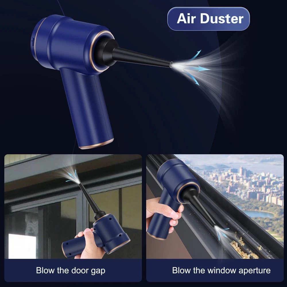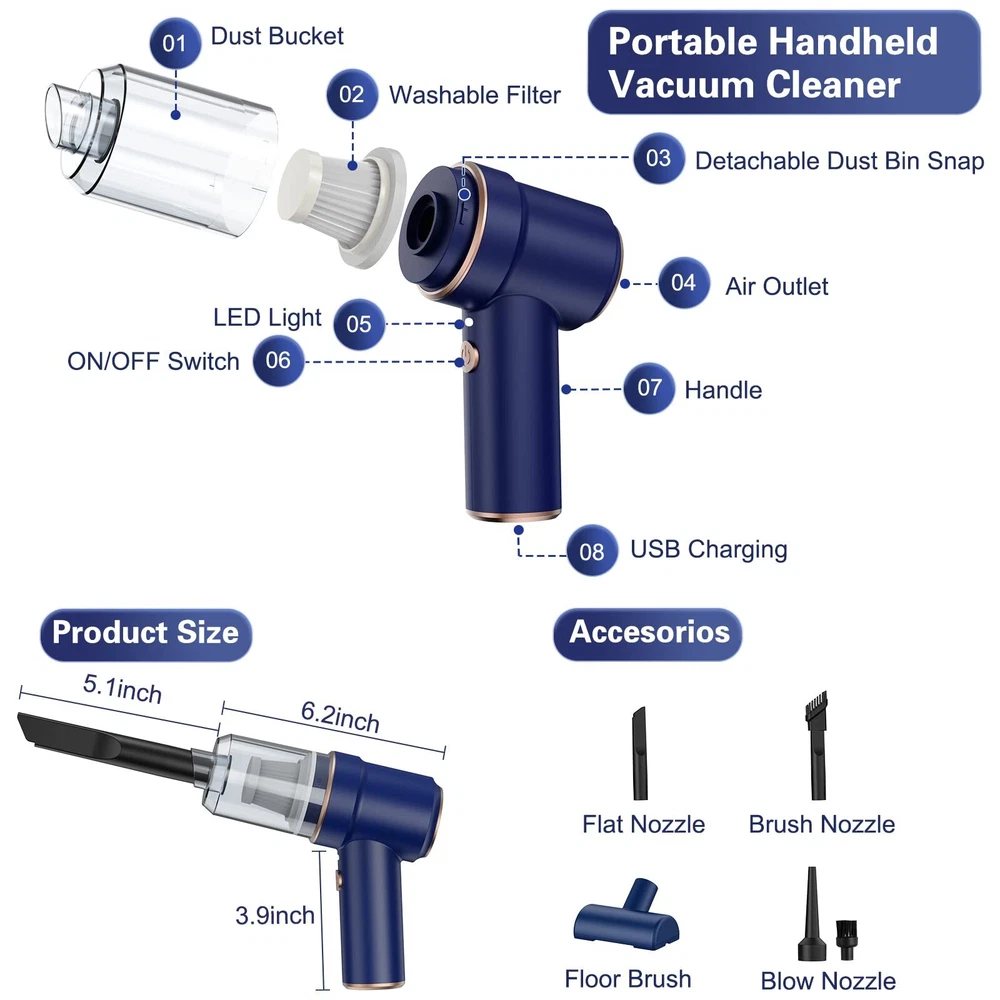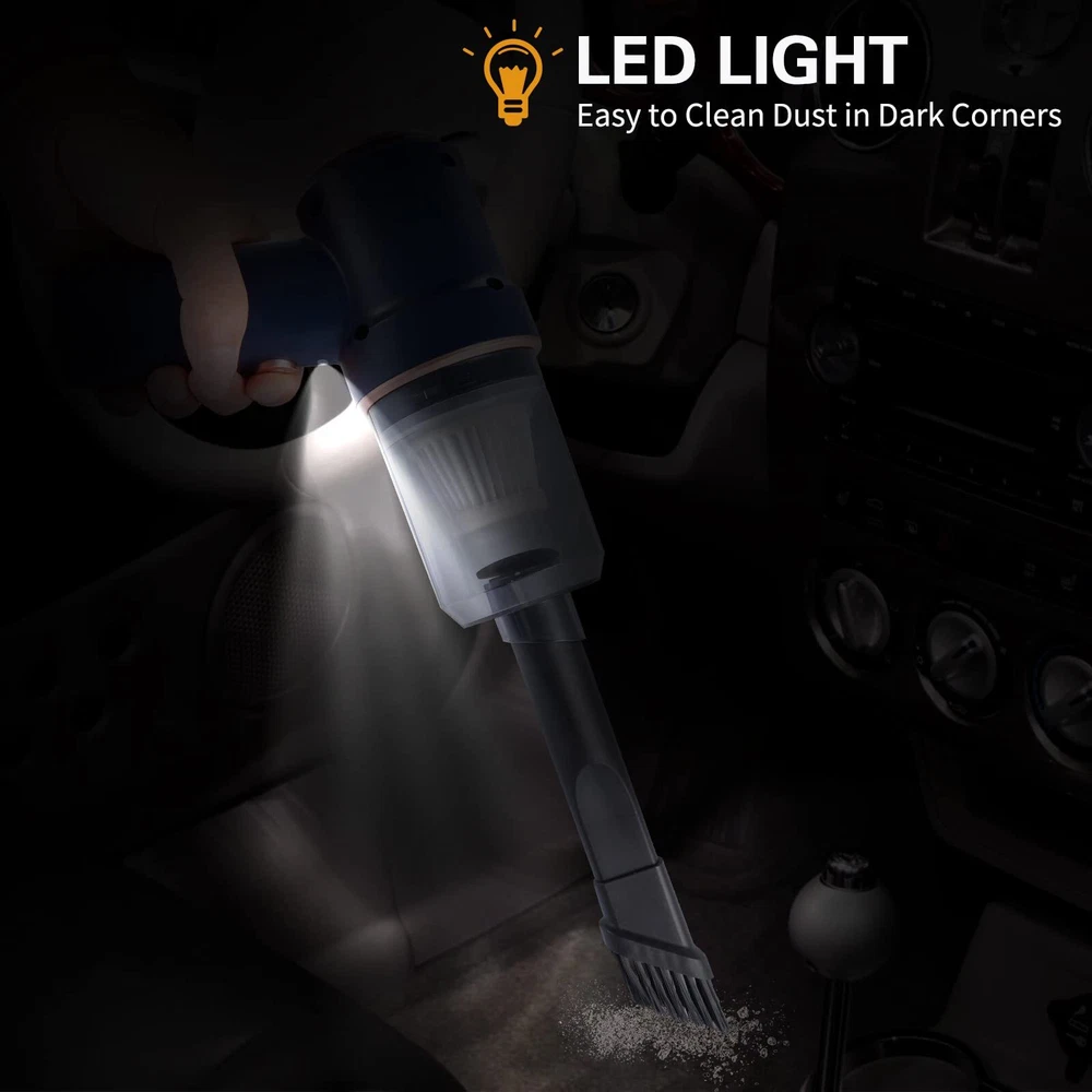 Handheld Vacuum:This mini vacuum is very convenient to carry, weighs only 350G, suction power 45W, good ideal for cleaning small mess in small crevices , such as sliding doors tracks, sliding windows, drawers, computer hosts, car doors, sofas, keyboards, sewing machines, pianos, etc. Sucking and Blowing Function: This portable vacuum cleaner not only sucking up dust, but also blowing away the dust, end of the accessory connection is the vacuuming effect, can as dust buster, and the other end is the blowing function, can as air duster. The handheld vacuum cordless has a smart design, which gives you efficiently cleaning experience. Cordless and USB Rechargeable: This handheld vacuum cleaner adopts 4000mAh lithium-ion battery which can bring more suction power, and adopts 5V/2A adapter can quickly fully charge in 2.5-3 hours. The cordless design allows you to carry wireless vacuum easily. It is convenient to take away, easy to use this cordless handheld vacuum to clean dust and other tiny particles in car, at home and office. Reusable and Washable Filter: This small vacuum cleaner HEPA filter can washable and reusable. The filter is easy to assemble and disassemble. Using tip: If the vacuum filter is full of dirt or suction weakens, please clean the filter in time to make sure the dust buster can work properly. Package Included : 1* Handheld Vacuum, 1*Multifunctional Suction Nozzle (Flat + Brush), 1* Multifunctional Air Nozzle ( Fine + Brush), 1* Floor Brush, 1* USB Cable, 1* Manual, 2*HEPA Filter. ( Attention: please don’t sink the machine into the water in case of short circuit)