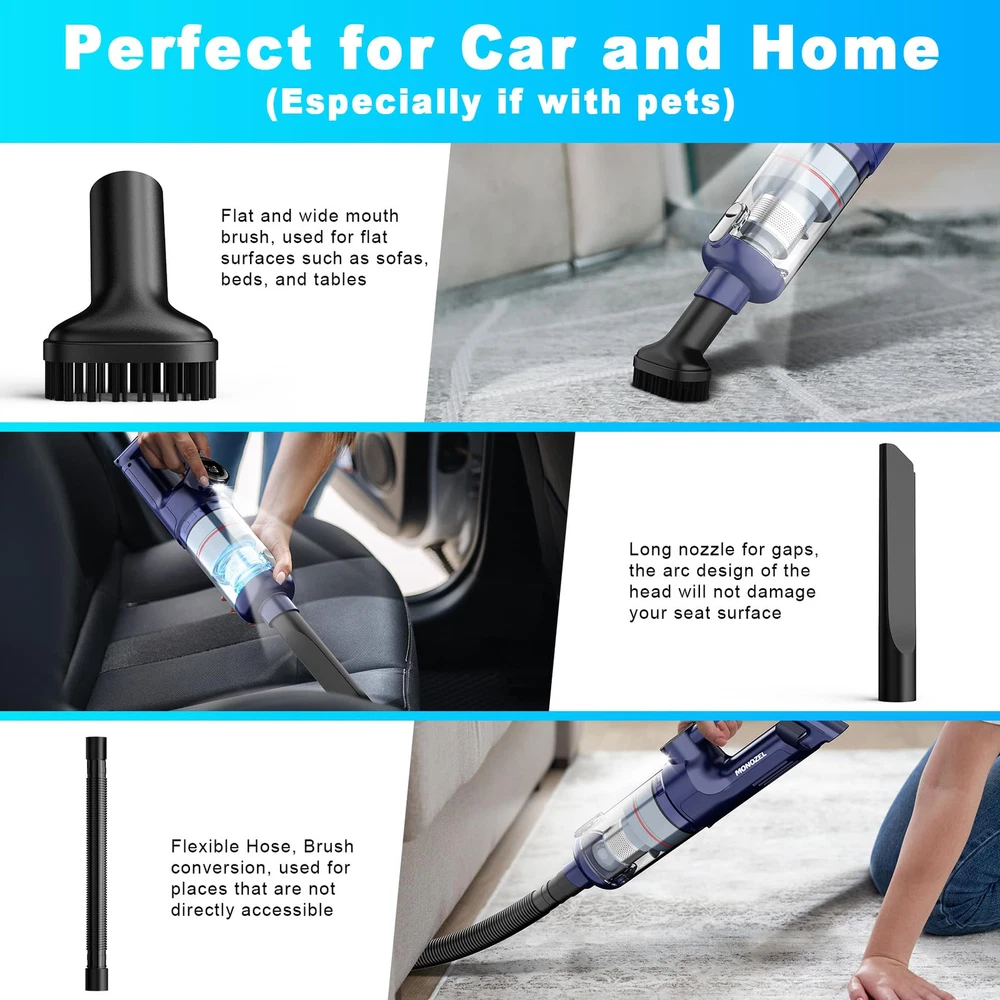 15000Pa SUCTION AND BRUSHLESS MOTOR: Built with the upgraded brushless motor, our hand held vacuum cleaner has a suction up to 15000Pa(Max mode), very powerful!!! It also has an Eco mode of 10000Pa for simple cleaning tasks. It can help you to do all-around cleaning with a powerful motor and long battery life. The portable vacuum cleaner cleans dust, crumbs, and pet hair from carpets, living rooms, kitchens, and offices with outstanding performance. LONG BATTERY LIFE AND FAST CHARGING: With multiple 2000mAh*3 batteries and quick charge tech, the battery life is extended by about 26 minutes when fully charged for 4 hours. The LED light on your cordless car vacuum works well to illuminate those dark, hard-to-see places. Only need to press the switch and it will start working, don't have to hold it down with your hands, which is very convenient. FULL PROFESSIONAL ACCESSORIES: The brush tool can clean hair and dust that is on the surface, and the crevice nozzle tool can be used to clean sofas, crevices, and corners. An extension tube can dust baseboards, blinds, and those pesky cobwebs in the ceiling corners. Any inch of your house/car can be covered with the full accessories. Perfect for those who have pets also. It comes with 2 reusable durable HEPA filters to meet your usage needs. The included adapter can better protect charging. EASY TO CLEAN: With just one click dismantling, you can easily dump garbage and clean the Vacuum Cleaner. Only weighs 1.4lb, portable and easy to hold. The enhanced HEPA filter can be washed and reused, ensuring efficient suction power while keeping dust and dirt outside to prevent blockage. Please dry it before putting it back into the vacuum. DURABLE VACUUM & CUSTOMER SUPPORT: With the upgraded brushless motor, our hand vacuum has a longer life. You can put it in your home, car, or even office. If you have any questions or problems about our rechargeable hand held vacuum cordless, don't hesitate to get in touch with us. customer team provides 24-hour technical support, quality guarantee, and money-back services.
