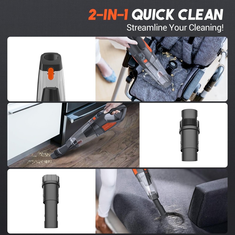 Handheld Vacuum Cordless Car Vacuum, Dust Buster Hand Vcauum Rechargeable with Large-Capacity Battery, Lightweight Rechargeable Powerful Portable Vacuum for Car, Home and Pet Hair Product Details Color: Orange Brand: Jeshow MPN: SL81B UPC: Does not apply EAN: Does not apply Brand: Jeshow Special Feature: Cordless Filter Type: HEPA Filter Included Components: Nozzle Is Cordless?: Yes Brand: Jeshow Special Feature: Cordless Filter Type: HEPA Filter Included Components: Nozzle Is Cordless?: Yes Capacity: 0.5 Pounds Wattage: 120 watts Runtime: 25 minutes Charging Time: 3.5 Hours Maximum Suction: 35.4 Inches Recommended Uses For Product: Office, Car, Home Form Factor: Handheld Color: Orange Model Name: SL81B Product Dimensions: 5.24"L x 6.42"W x 17.24"H Battery Description: Lithium-Ion Noise Level: 70 dB Amperage: 10 Amps Manufacturer: Jeshow Number of Items: 1 Controller Type: Push Button Control Method: Touch Style: Sleek Number of Speeds: 2 Portable: Yes Number of Handles: 1 Number of Power Levels: 2 Indoor/Outdoor Usage: Indoor Item Weight: 1.52 pounds Item model number: SL81B Batteries: 1 Lithium Metal batteries required. (included) Batteries required: Yes Battery type: Lithium-Ion Powerful Suction and Two power modes: Cordless Handheld Vacuum cleaner with built-in high efficiency motor. It can provides 9000Pa super suction at powerful mode. Easy to clean dust, debris, pet hair, etc Cordless Ultra-light: Handheld vacuum cleaner is cordless and just 2.2 pounds weight, which is suitable for people with different ages to operate. It can help you move freely to clean your home, office, car or hard-to-reach corner. because handheld vacuum cleaner is very light, which is easy for home and car cleaning. Multi-suction nozzle and Large Capacity Dust Cup: This handheld cordless vacuum cleaner comes with 2 different accessories to meet your different needs. And it has a 500ML trash to clean in all directions Fast charging: The handheld vacuum cordless machine is equipped with a 2500mAh lithium-ion battery and can be fully charged in only 3-3.5h, running for about 25 minutes, while the LED indicator shows the remaining power to remind you to charge. After sales service: This hand-held cordless vacuum cleaner is the perfect gift for friends and families to enjoy the smart life. If you have any question or inquiry about our products, please feel free to contact us. Our client service team is always ready for your inquiry and will do our best to help each client.