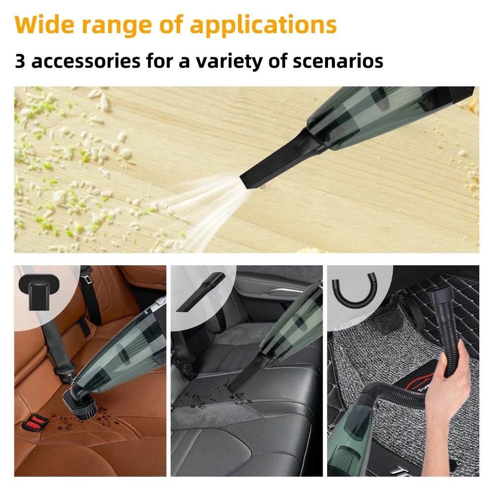 Car Wireless Vacuum Cordless Handheld Powerful Cyclone Suction Portable Rechargeable VacuumCleaner QuickCharge for Home Pet Hair Available with or without useful storage bag When you're done for the day, store the device safely for next time. Usage and Care Before cleaning, please ensure that vacuum cleaner has power and the filter is dry before using. The battery's LED light appears red during charging and green when charging is over. The battery can be charged with car or phone chargers. After vacuuming up water, open the front cover to drain out the liquid. Specifications Material: ABS Color: black Height: 33.8cm/13.3in Weight: <550g/1.2lb Width: 9.5cm/3.7in Charging volt: 12V Charger: USB charger Power: 120W Battery type: lithium battery Battery capacity: 2200mAh Suction power: 9000 PA+ Working time: 25–30 minutes Charging time: 3–4 hours Cleans dry/wet surfaces: yes Optional bag dimensions: 36.5×9.3×11cm/14.3×3.6×4.3in Package Contents 1 × vacuum cleaner 1 × dust cap 1 × small brush 1 × narrow nozzle 1 × stretch hose 2 × auxiliary joints 1 × bag (optional) 3 attachments to reach difficult spots Your helpful device's small brush pulls up breadcrumbs from the floor, and the narrow nozzle fits between seat cushions. Its stretched hose cleans tighter places below desks or sofas. 70dB or less sound level for low-noise cleaning Enjoy quietly tidying up dust and dirt. Cyclonic suction is environmentally friendly Debris is pushed aside and down to the bottom of the bagless cyclone by rotating air. Handy wireless design and easy USB charging Use your car or phone cable to power your portable vacuum and take it with you on journeys. Easy-to-store 33.8cm/13.3in length and practical 550g/1.2lb weight Use your lightweight and compact machine around the home, which takes up minimal space when stored. Anti-allergen washable and removable HEPA filter Trap dust mites, mold spores and pollen. Improve the quality of your air by vacuuming frequently.