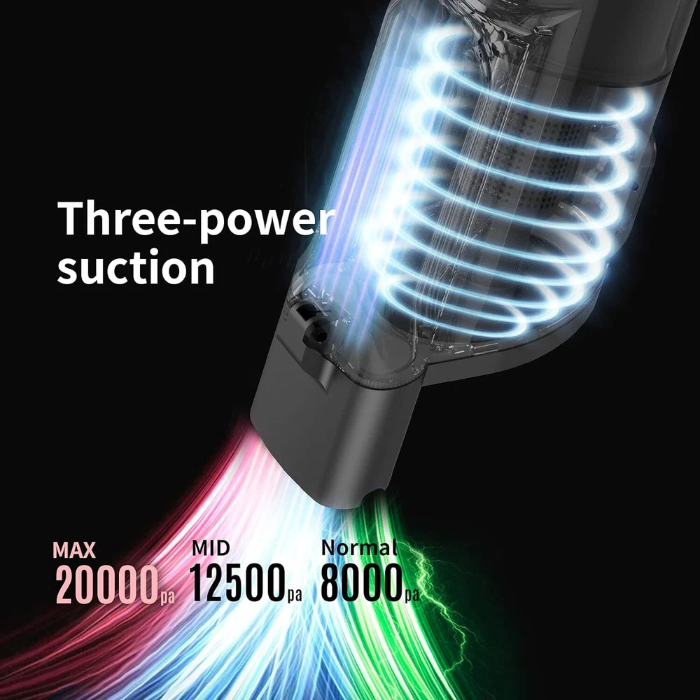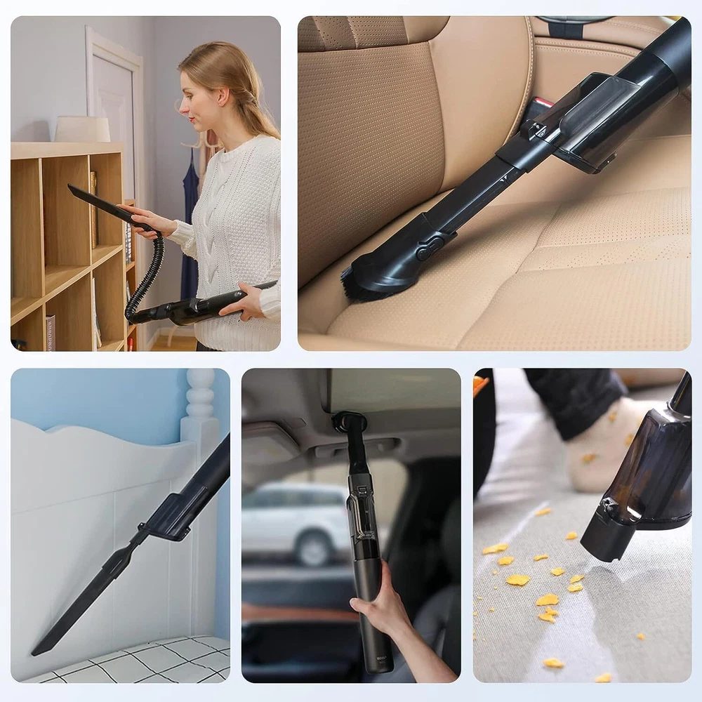 Powerful 3 Power Modes:The handheld vacuum cordless adopts a 150W powerful aluminum fan motor, provides 20000Pa great suction power on strong mode, can easily clean dust, debris, pet hair, and other large particles in seconds. Only one button is featured with this mini vacuum cleaner, easy to operate and adjust power mode. Handheld Vacuum Cordless cleaner: The handheld cordless vacuum comes with 5 attachments to meet various cleaning needs. The flat nozzle is perfect for reaching narrow gaps and corners. The brush nozzle is designed to remove hair from carpets, sofas, or dust from keyboards. The extended flexible hose nozzle allows for reaching desired spots with ease. Unique Cyclone Chamber Design: introduces the revolutionary cyclone separator into a compact handheld vacuum cleaner for the first time. The car handheld cordless vacuum distinctive cyclone design not only maximizes the smooth airflow through the filter, alleviating clogs but also maintains consistent suction power. It enables the vacuum cleaner to operate with high efficiency and powerful suction at all times, ensuring deep cleaning performance. Quick Charging and Extended Runtime: This car vacuum cleaner is equipped with a high-power, high-capacity battery, which can be fully charged in 3-6 hours . It can operate in low, medium and high modes for 50 minutes, 22 minutes, and 12 minutes respectively. This allows you to clean various areas without interruptions. Additionally, the car vacuum cleaner comes with a charging cable, allowing convenient charging in your car or at home, ensuring you always have sufficient power to complete your cleaning tasks. Effortless Garbage Handling: The handheld vacuum cleaner is designed for easy dust disposal. Simply press the cleaning chamber button to empty the trash, ensuring your hands stay clean. The transparent design allows you to see the vacuuming process clearly, reminding you to clean it in time. With a generous capacity of 150 milliliters, this handheld vacuum cleaner fully meets your daily car cleaning needs for garbage storage.