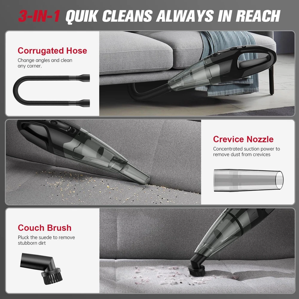 【Versatile Cleaning】This hand held vacuum is equipped with attachments: crevice brush, sofa brush, and long hose, making it capable of precisely cleaning areas such as sofa crevices and car seat bottoms. 【Illumination】Equipped with an intelligent LED light, this vacuum illuminates your work with precision, guiding you swiftly and accurately. This feature enhances the overall performance of this car vacuum. 【Portable and Versatile】Its compact size and ergonomic design make handling and maneuvering easy, allowing you to clean tight spaces and high areas effortlessly, a must-have for handheld vacuum cleaner. 【Low Noise and Lightweight】Emitting noise as low as 75 decibels, akin to a gentle breeze, it ensures a comfortable cleaning environment. Weighing just 1.65 pounds, it allows for continued usage without fatigue. 【Convenient Charging】The USB charging provides easy energy supply, while the chargeing light in the USB line reminds you of the charging status, especially useful for this cordless handheld rechargeable vacuum. 【After-sale Service】If you have any dissatisfaction in the process of using this product, please do not hesitate to us at any time, our will be happy to serve you.