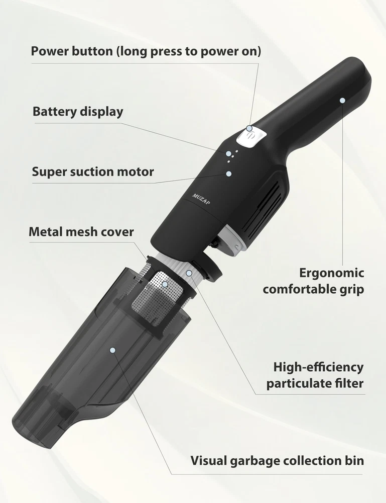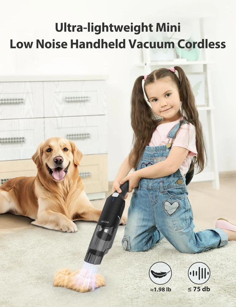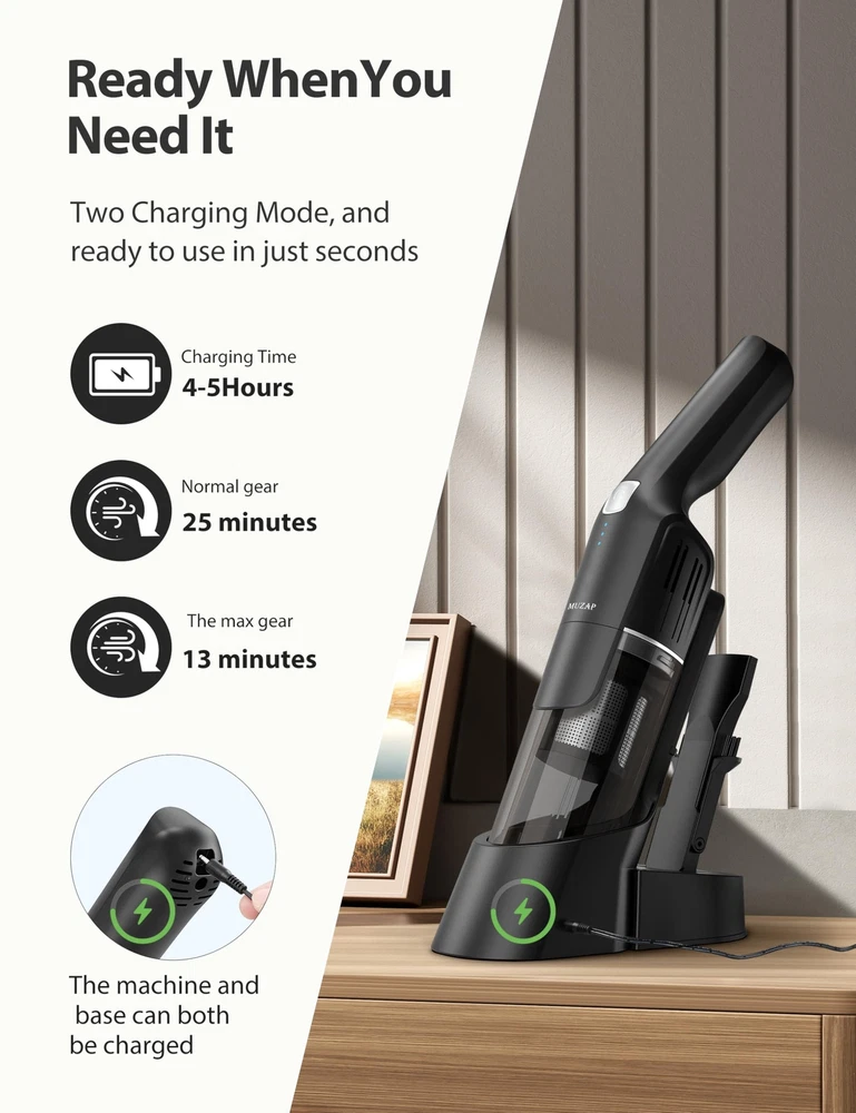 ππ€π¬ππ§ππͺπ‘ ππͺππ©ππ€π£:The handheld vacuum cordless features a self-developed high-speed motor with two suction modes (Standard and Max Power),Clean stubborn pet hair from carpets,stairs,carand other upholstery 2-ππ£-1 πΎπ‘πππ£ππ£π ππ€π€π‘:Designed for easy cleaning of tight spaces such as sofa crevices,car seats,kitchen corners,and keyboards,effectively removing pet hair and small particles. πΏπ€πͺππ‘π πππ‘π©ππ§ πππ¨πππ£:99%Dust removal rate,filter element can be cleaned and reused. 500ππ πΏππ©ππππππ‘π πΏπͺπ¨π© πΎπͺπ₯: A large-capacity dust cup with washable filter and metal mesh.Replacement filters are available for separate purchase. πΎπππΏππππ πΎπππππππππΎπ- Portable, rechargeable,+lightweight for use around your home and in your vehicle.With a charging base,more convenient placement. πππ¨π© πΎπππ§πππ£π &πππ¨π©ππ£π ππ€π¬ππ§:Ultra-high speed motor+with dual charging system, Full charge time is 4-5 hours,Standard mode (8000pa): Run for 30 minutes, Maximum mode (15000pa): Run for 15 minutes. ππ§ππ€π£π€π’ππ πΏππ¨πππ£:This lightweight, handheld vacuum cordless is ergonomically designed with a comfortable handle, Just 1.4lb,suitable for users of all age groups. πππ₯π’πππ₯π πππππ«-πππ₯ππ¬ πππ«π―π’ππ:Backed by factory-direct production, providing excellent support and a 1-year warranty.