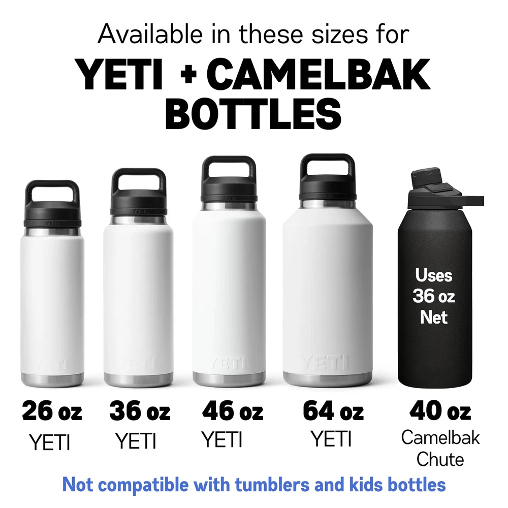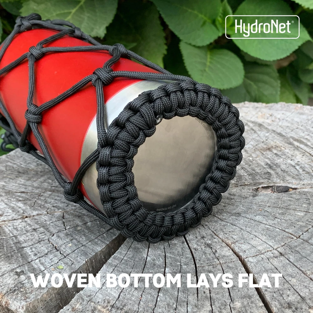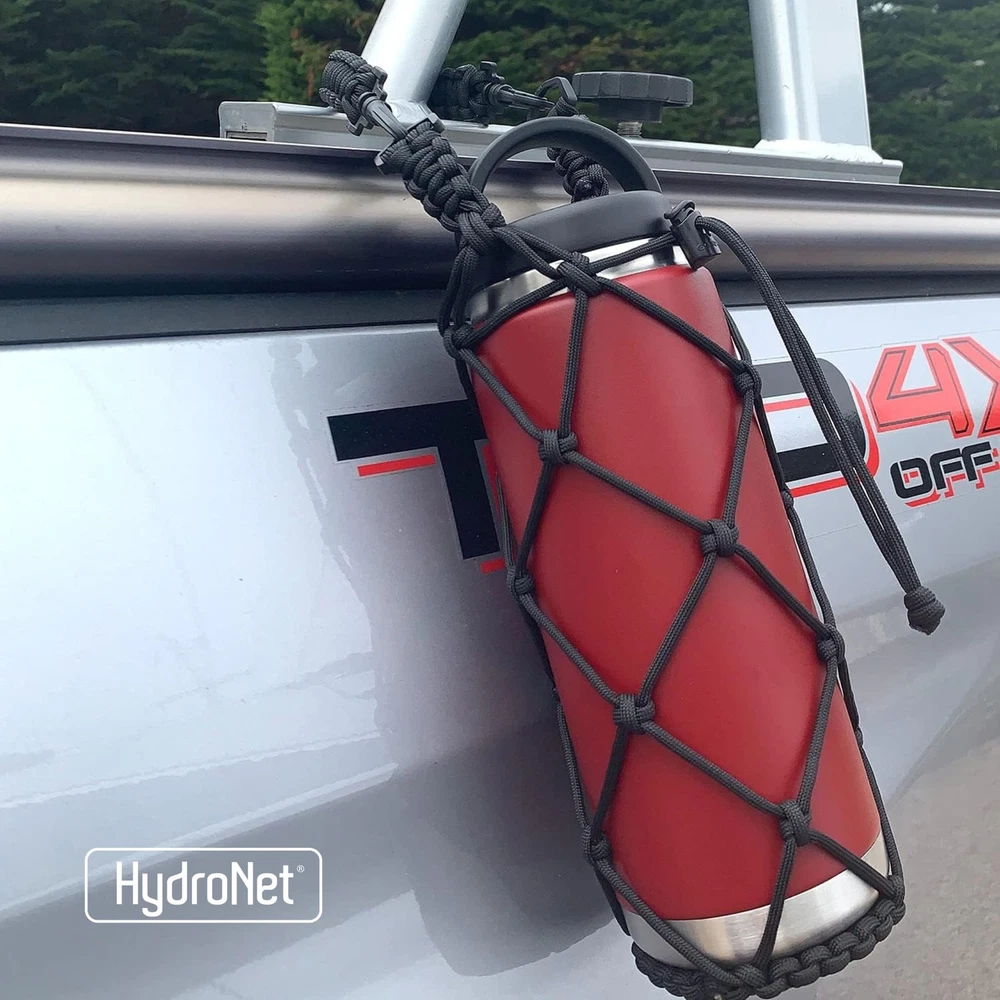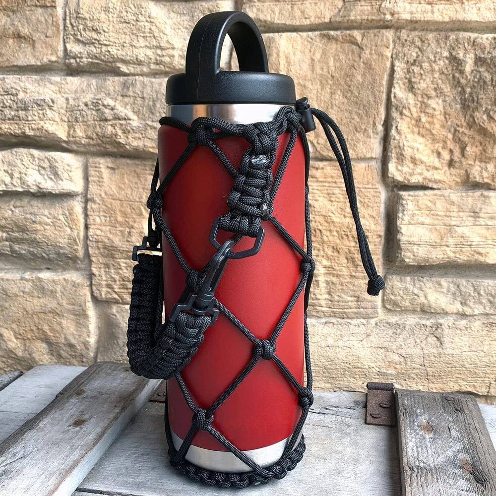 Now it's easy to carry your water bottle. WHAT'S INCLUDED: Paracord net with handle and detachable shoulder strap. Compatible with YETI RAMBLER 36 oz and CAMELBAK CHUTE 40 oz water bottles. HydroNet paracord carriers are available only from USA. Constructed with high quality, military grade parachute cord for YETI water bottles. Includes paracord carrier and handle with shoulder strap. The HydroNet paracord water bottle carrier with strap is available only from USA. Designed for fit. Compatible with YETI Ramblers, plus any stainless steel water bottle of similar size. HydroNet is a practical water bottle carrier for walking and hiking (see the shoulder strap!) Designed for comfort. Just grab and go. Because it is lightweight and durable, it's favored as a water bottle handle strap for school, work, or the outdoors. You can carry more while dropping less. Easy to remove and clean after rugged use, this paracord water bottle holder for hiking will become an essential piece of your backpacking gear, hiking gear and camping accessories. Having your water bottle with you is the key to hydration. HydroNet, a military grade, high performance paracord water bottle holder with strap, doubles as a handy survival tool. If you have to unravel the carrier in an emergency situation to tie knots, throw a line, etc. we will replace your HydroNet for free.