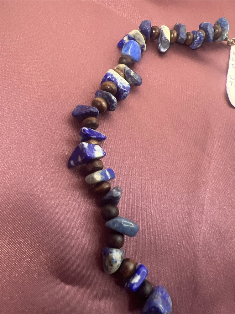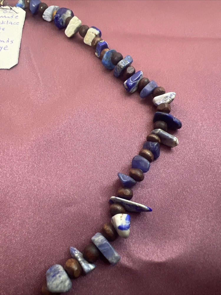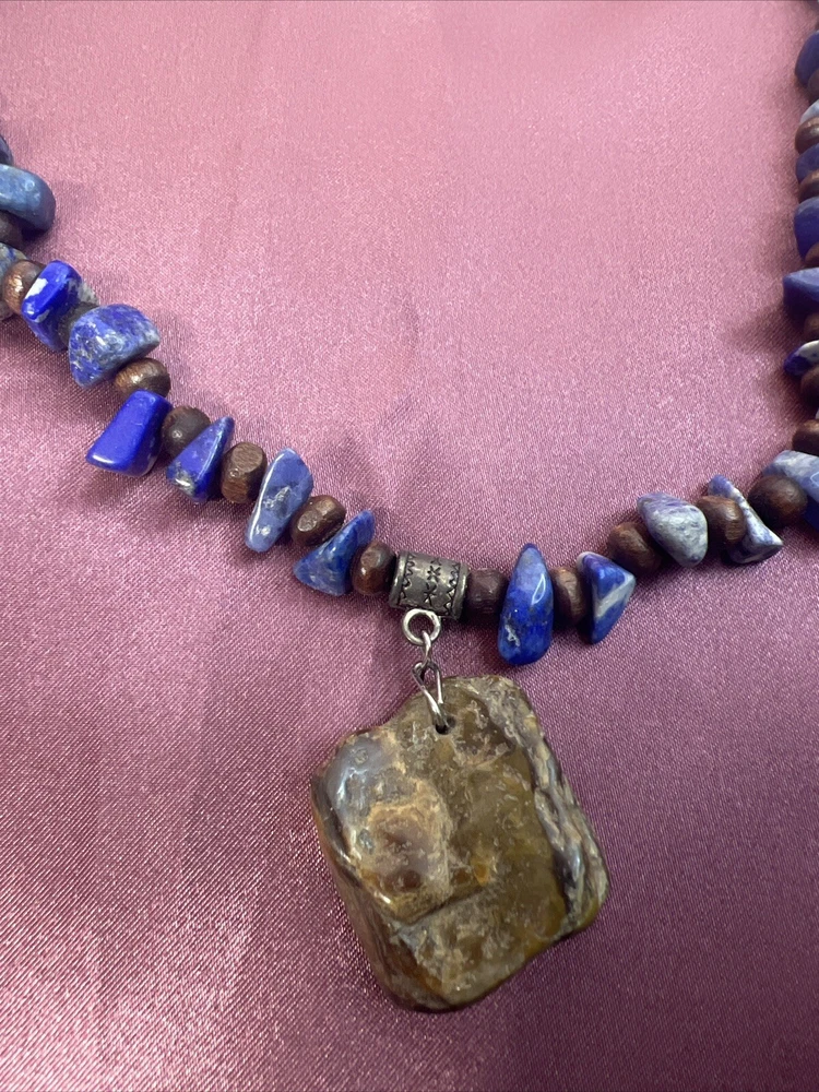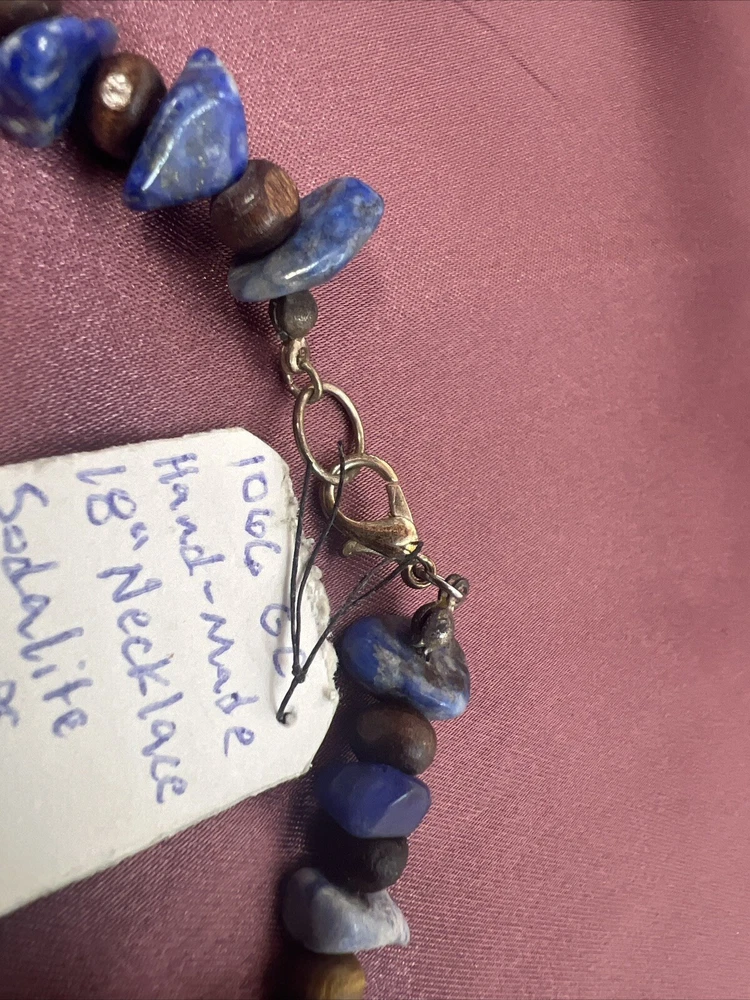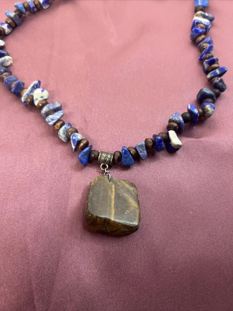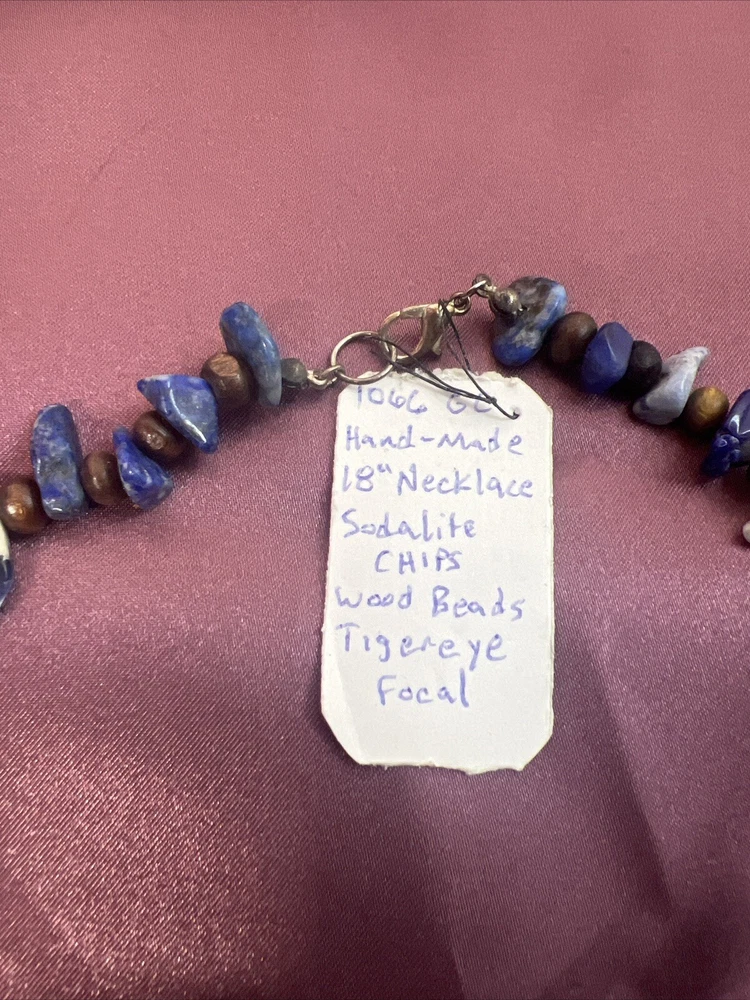 Enhance your jewelry collection with this 18-inch handmade necklace featuring sodalite chips and wood beads that exude elegance and finesse. The necklace has a tiger-eye focal and showcases a beaded style that is perfect for any occasion. This necklace is crafted with quality materials and is ideal for those who appreciate artisan jewelry. Its unique design and attention to detail make it a must-have addition to your jewelry box. It is a perfect gift for yourself or your loved ones. SKU-J19