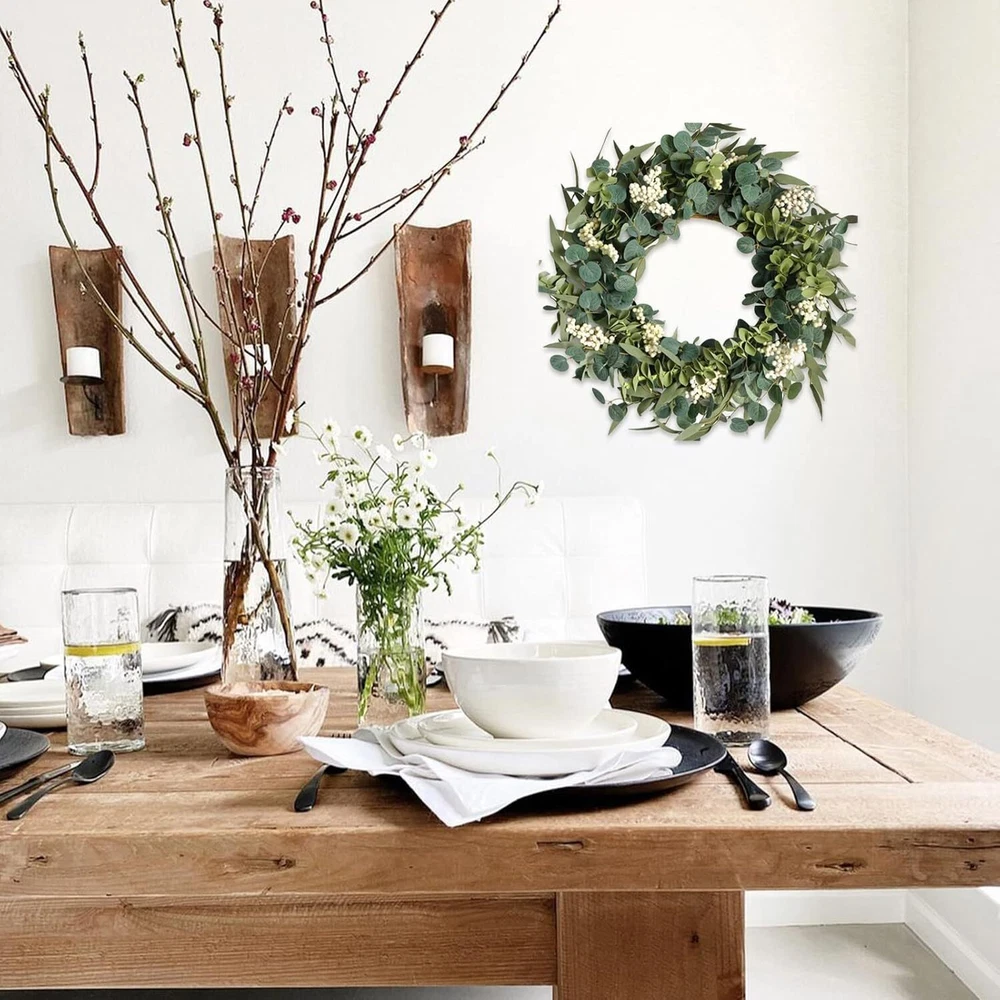 Elevate your space with the **20-Inch Artificial Eucalyptus Wreath** – a timeless, nature-inspired decor piece designed to bring the serene beauty of the outdoors to your home. Perfect for decor enthusiasts who adore natural aesthetics, this handcrafted wreath blends rustic charm with versatile elegance, making it ideal for year-round celebrations, farmhouse styling, or thoughtful gifting. 🍃✨ Features: ✨ All-Season Elegance in 20 Inches With a generous 20-inch diameter, this wreath creates a striking focal point for any space. Its lush blend of artificial eucalyptus leaves, willow sprigs, and tiny white berries mimics nature’s perfection, offering a fresh, vibrant look for spring, summer, holidays, or everyday decor. ✨ Handmade with Premium Craftsmanship Every detail is meticulously crafted by hand, ensuring a realistic, high-quality finish. The durable artificial foliage retains its shape and color, while the reinforced wire frame guarantees longevity – no wilting, watering, or maintenance required! ✨ Versatile Decor for Every Occasion - Front Door Welcome: Impress guests with a lush green greeting. - Indoor & Farmhouse Charm:Adorn walls, windows, mantels, or rustic kitchens. - Outdoor Oasis (Shaded Areas Only): Spruce up porches, patios, or garden gates. ✨ Upgraded Design for Durability & Style The new 2025 version features a sturdy, weather-resistant base (for shaded outdoor use) and an earthy burlap bow for added farmhouse flair. Its lightweight design ensures easy hanging indoors or outdoors with any standard hook. ✨Warm note:Each package contains one wreath. Shipping and packaging may cause the wreath to warp, don't worry, you can take the wreath out and adjust it to your liking. Thank you for your purchase. If you have any questions about your wreath, please feel free to contact us and we will provide you with the best solution. Specifications: Color - Green Material - Foam, Plastic Mounting Type - Door Mount Shape - Round Product Dimensions - 3.5"D x 20"W x 20"H Seasons - Summer, Spring Indoor/Outdoor Usage - Outdoor, Indoor Package List: 1pc