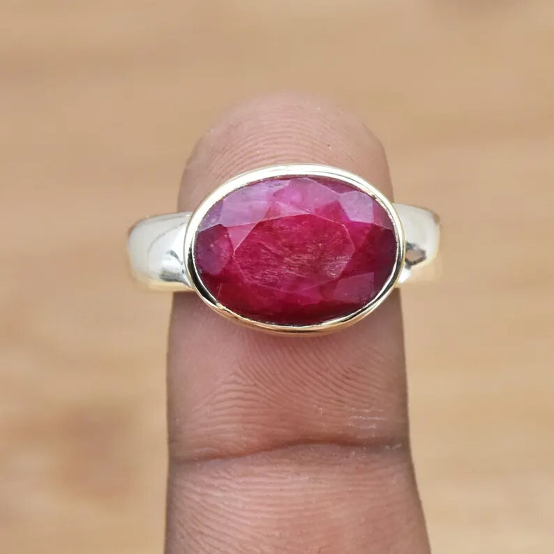 This stunning handmade Indian Ruby ring is a perfect statement piece for those who love unique, bold jewelry. Crafted with care and precision, it features a radiant Indian Ruby set in high-quality 925 sterling silver. The thick band design adds a modern touch, while the two-tone finish gives the ring an eye-catching, bohemian flair. Whether you’re treating yourself or searching for the perfect gift for someone special, this ring is sure to impress. Key Features: Material : 925 Sterling Silver Stone : Indian Ruby (July Birthstone) Design : Handmade, Two-Tone, Bohemian Style, Thick Band Perfect For : Birthdays, Anniversaries, Special Occasions, or Everyday Wear Gift Idea : Ideal for the woman who loves unique, statement jewelry Why You’ll Love It: Elegant & Timeless : The deep red hue of the Indian Ruby adds a touch of elegance and sophistication to any outfit, making this ring perfect for both casual and formal occasions. Durable & Comfortable : Crafted from high-quality 925 sterling silver, the ring is both durable and comfortable for everyday wear. Unique Design : The two-tone finish and bohemian style make this ring stand out from the rest, offering a fresh take on classic jewelry. Meaningful Birthstone : As the birthstone for July, the Ruby is not only a beautiful gem but also symbolizes love, passion, and vitality—making it a thoughtful gift for those born in this month. Sizing Information: Available in various sizes. Please refer to the size chart for the perfect fit. Perfect Gift for Her: Whether for a birthday, anniversary, or just because, this Indian Ruby ring makes an unforgettable gift. Its unique design and stunning appearance will make her feel special and appreciated.