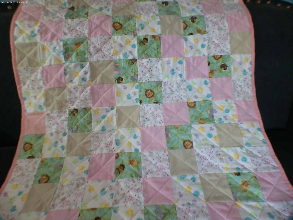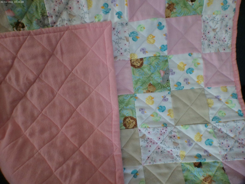 This item is a handmade baby girl's crib quilt made from all new flannel materials and featuring wildlife including monkeys, lions, giraffes, tigers, elephants, ducks and little birds along with coordinating prints. The coordinating color prints are pink and tan. This quilt's front and back are made from cotton flannel materials; the quilt contains new cotton batting. It is 40" x 46" in size. This quilt comes from a non-smoking, pet-free pet home. The buyer is to pay $10.99 shipping. Thanks for looking.
