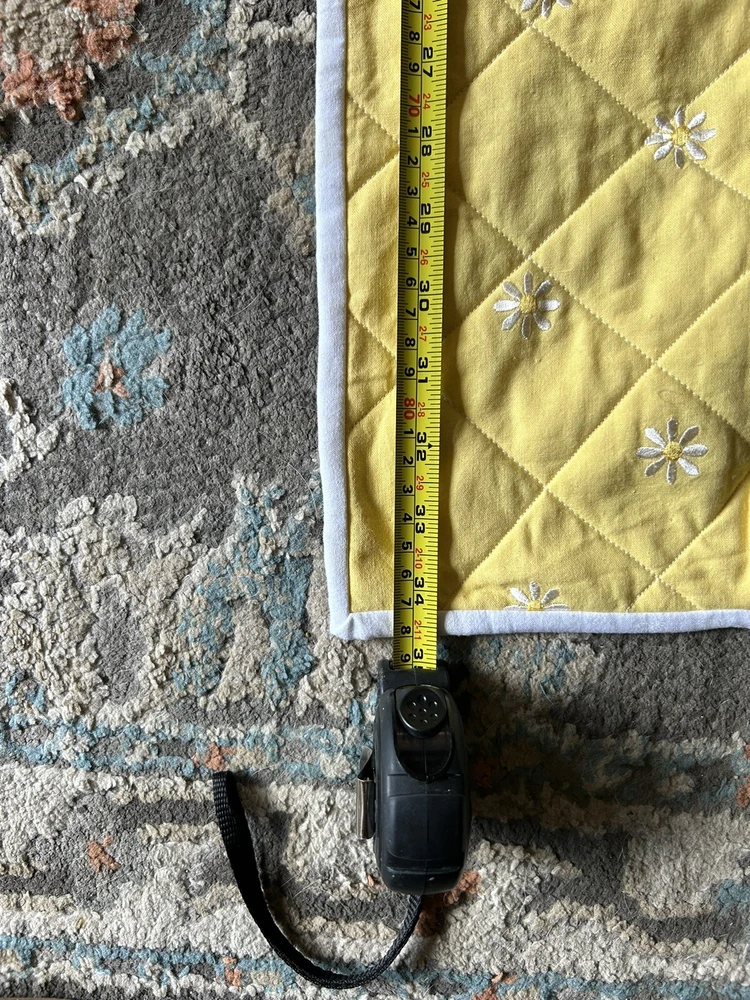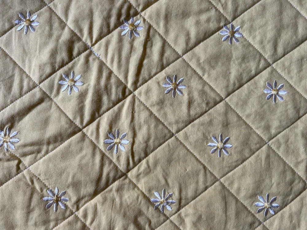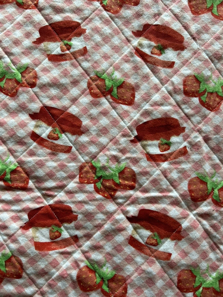 Handmade Babygirl Quilt Crib Daisies Strawberry Jam Summertime White Trim. This quilt was made by me :) All supplies purchased from JoAnn Fabrics. All fabrics prewashed. Top is cotton fabric with embroidered daisies. The backing is flannel gingham. The trim is hand stitched. Clean smell. Smoke free home. Please feel free to ask any questions. This is a handmade item so imperfections will exist. H01