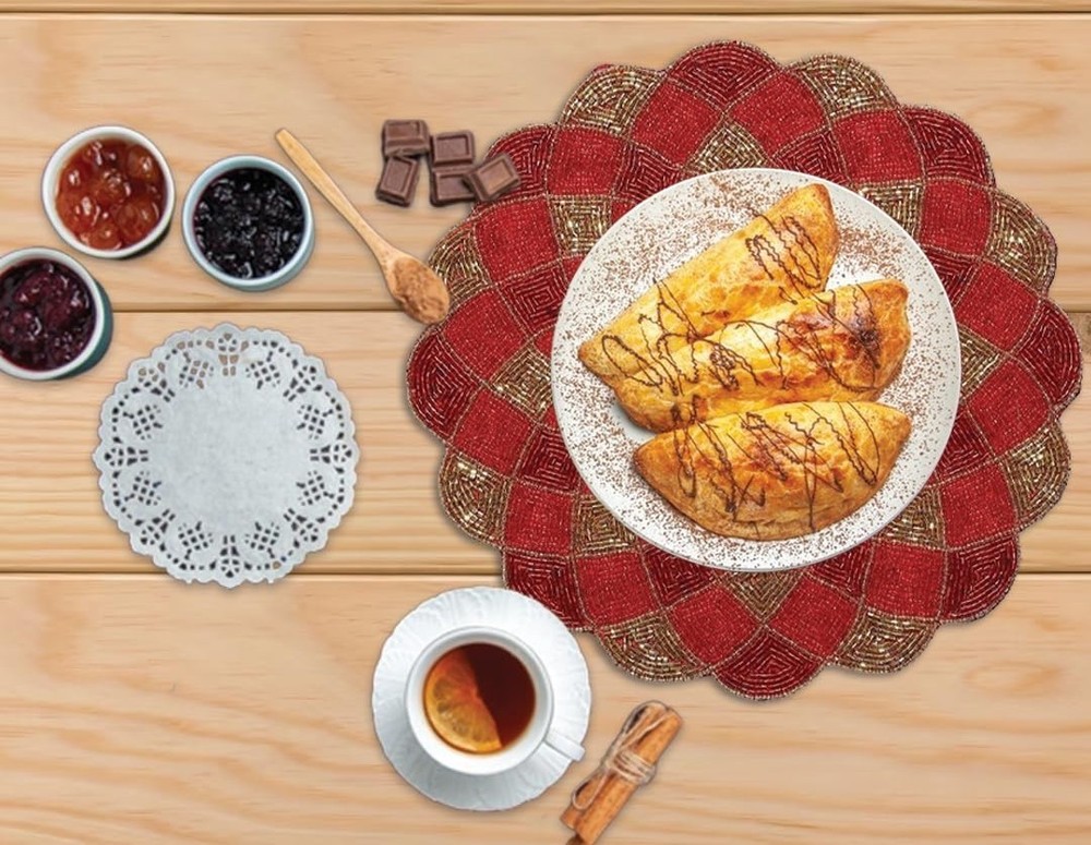 This handcrafted beaded placemat, made with glass beads in a rich red color, is a stunning addition to any boho luxe dining table setting. The abstract pattern and round shape make it perfect for special occasions like engagements, weddings, and anniversaries. The placemat adds a touch of elegance and sophistication to any dining experience, while the brand's handcrafted quality ensures a one-of-a-kind piece. Made in India, this placemat is sure to be a unique and eye-catching centerpiece for your table. Quantity : Set of 2 Size : 14 Inch