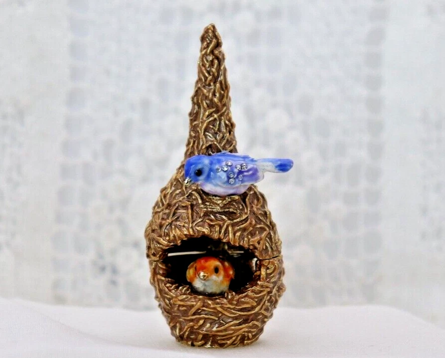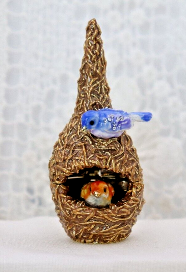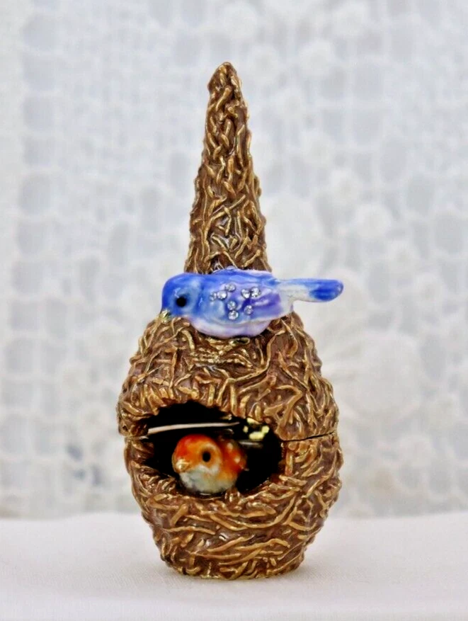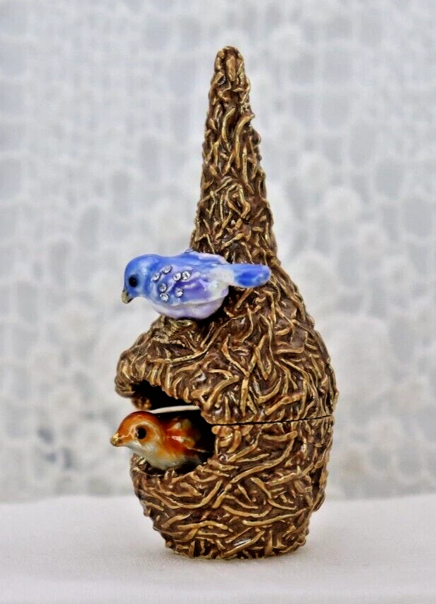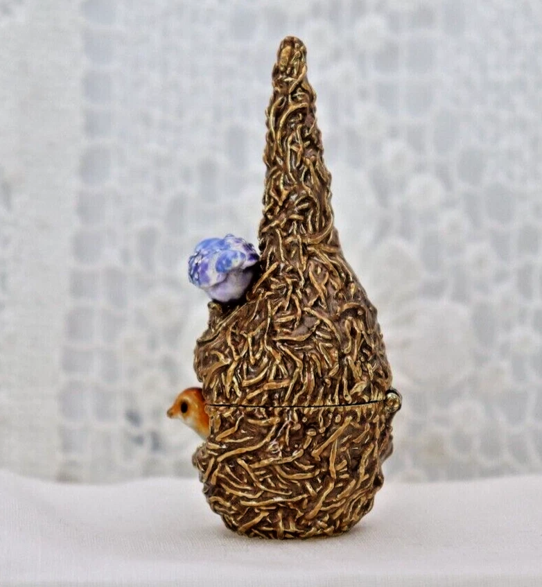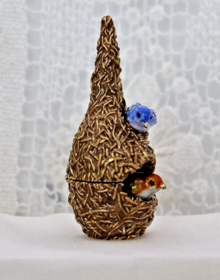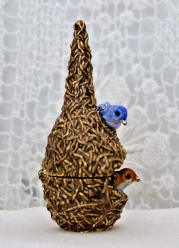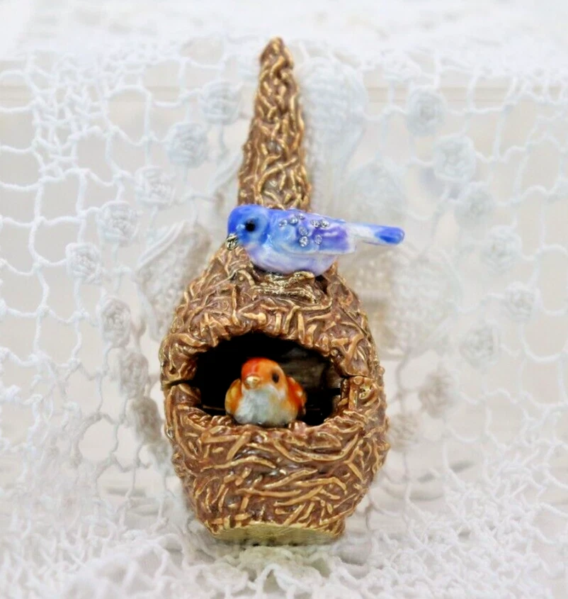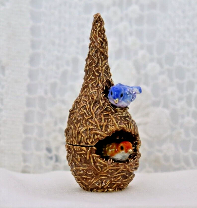 This handcrafted trinket box is designed as a bird nest with two adorable little birds and is adorned with Austrian Crystals by artisan Keren Kopal from Israel. The intricate details and colorful design make this piece a unique and original work of art. Perfect for storing small treasures or serving as a decorative piece, this one-of-a-kind trinket box is a beautiful addition to any collection. 3H x 1 1/4 x 1 3/8" D LBL Migration considers all offers. We know you will love your little treasure, but if for some reason you don’t, we will take care of you!