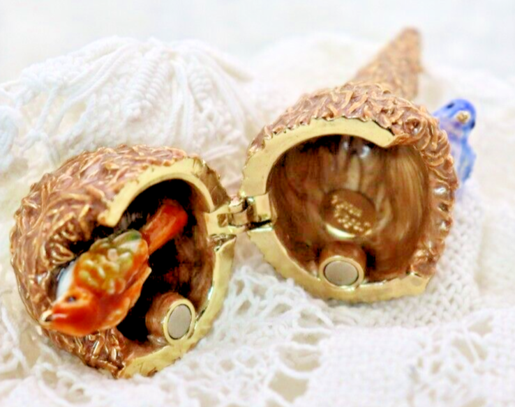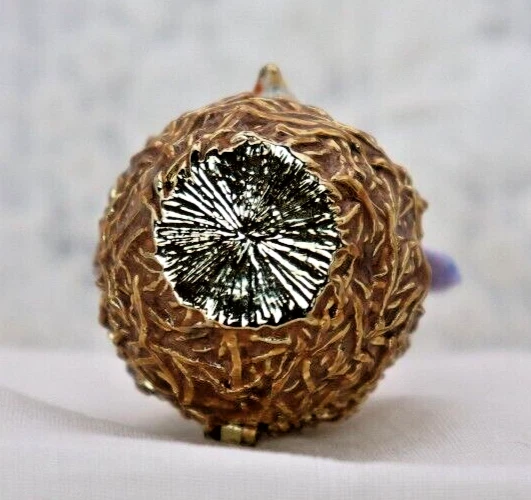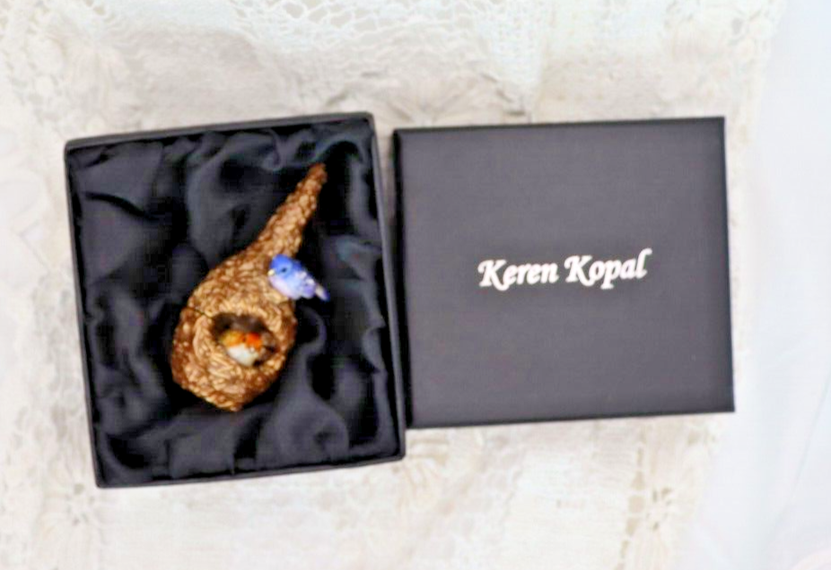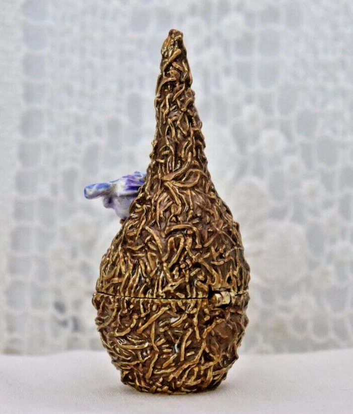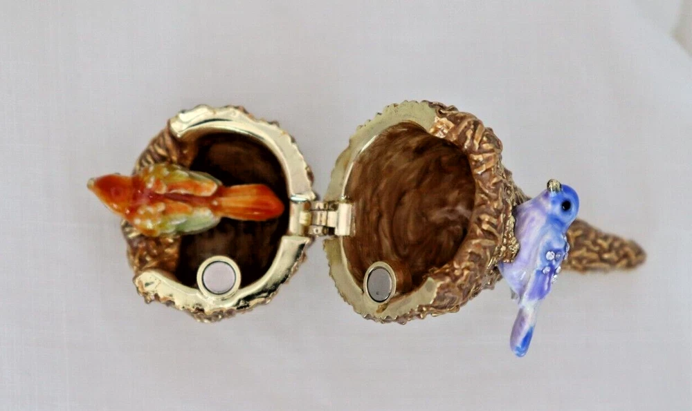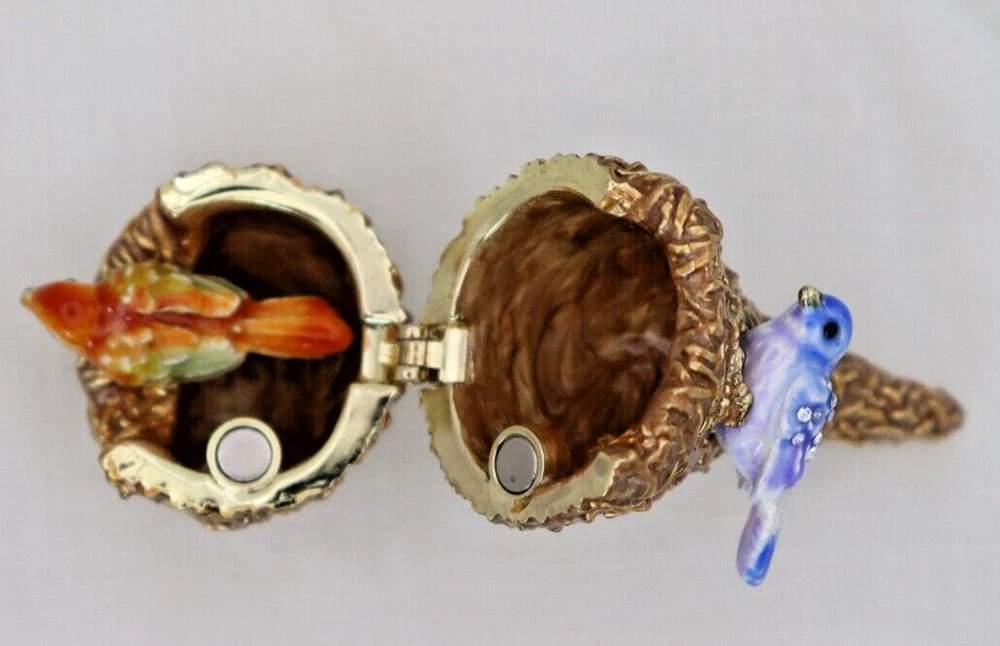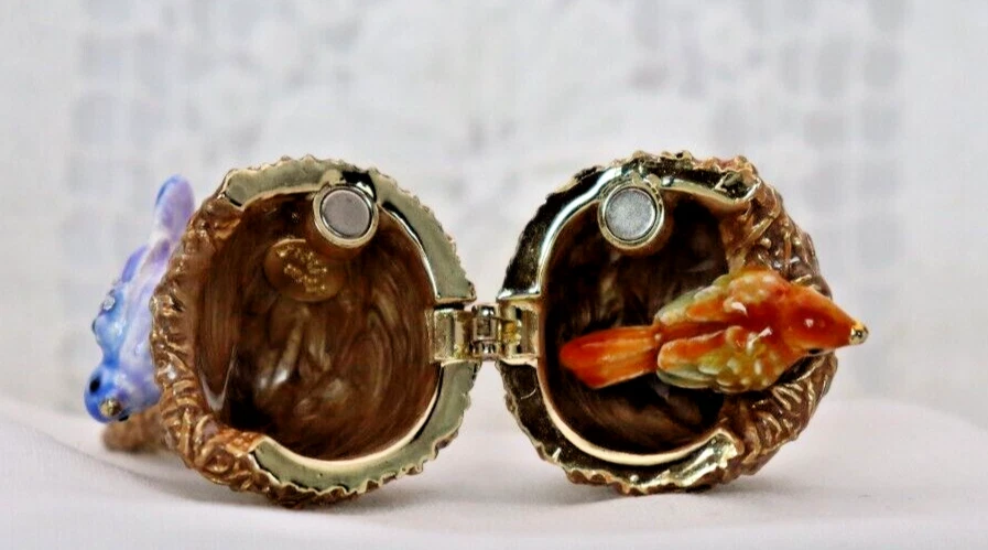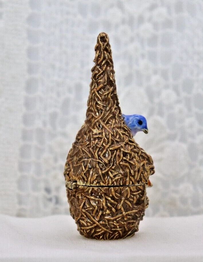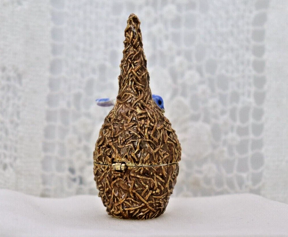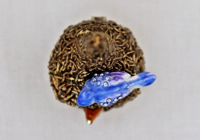 This handcrafted trinket box is designed as a bird nest with two adorable little birds and is adorned with Austrian Crystals by artisan Keren Kopal from Israel. The intricate details and colorful design make this piece a unique and original work of art. Perfect for storing small treasures or serving as a decorative piece, this one-of-a-kind trinket box is a beautiful addition to any collection. 3H x 1 1/4 x 1 3/8" D LBL Migration considers all offers. We know you will love your little treasure, but if for some reason you don’t, we will take care of you!