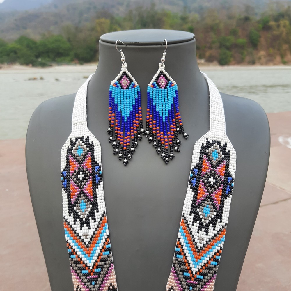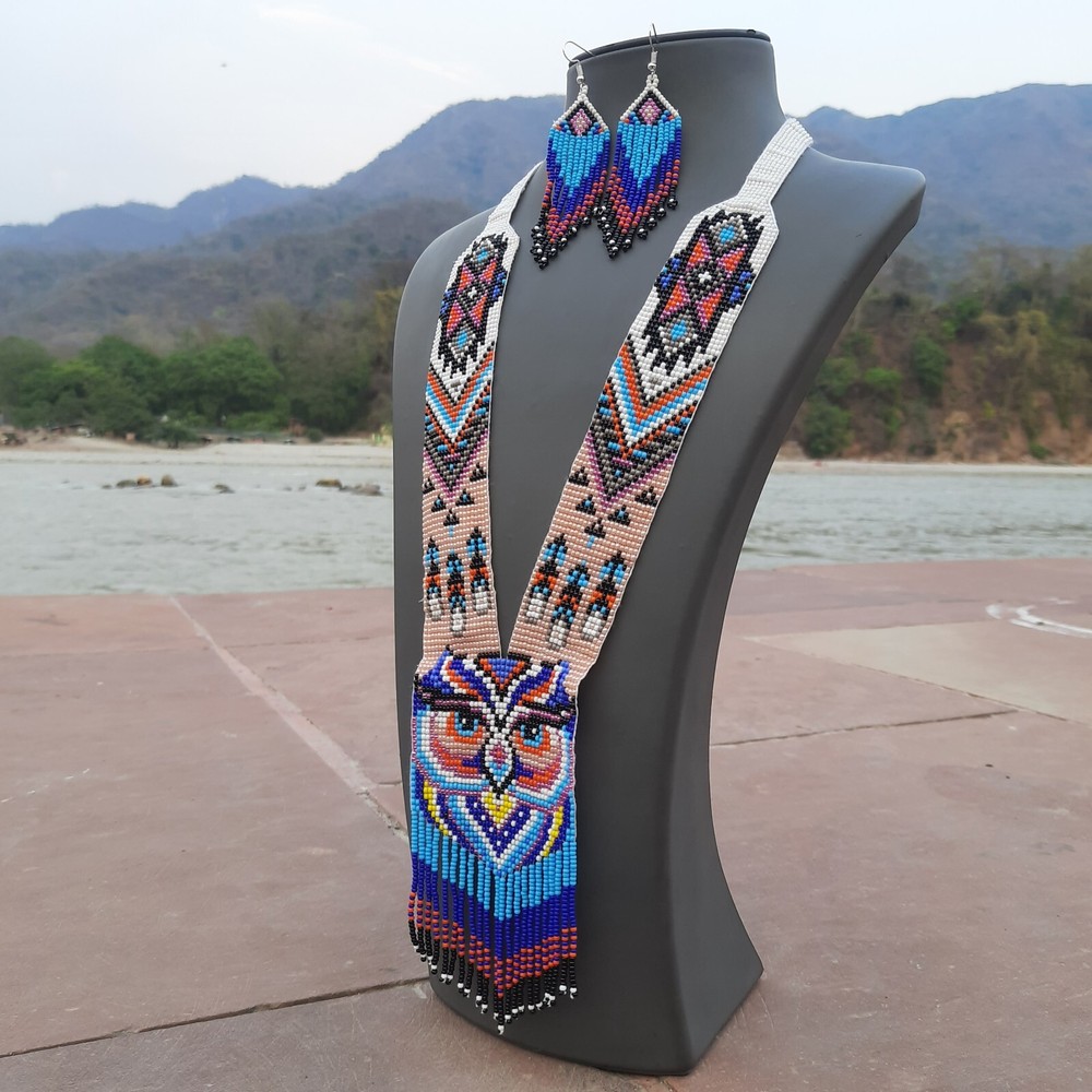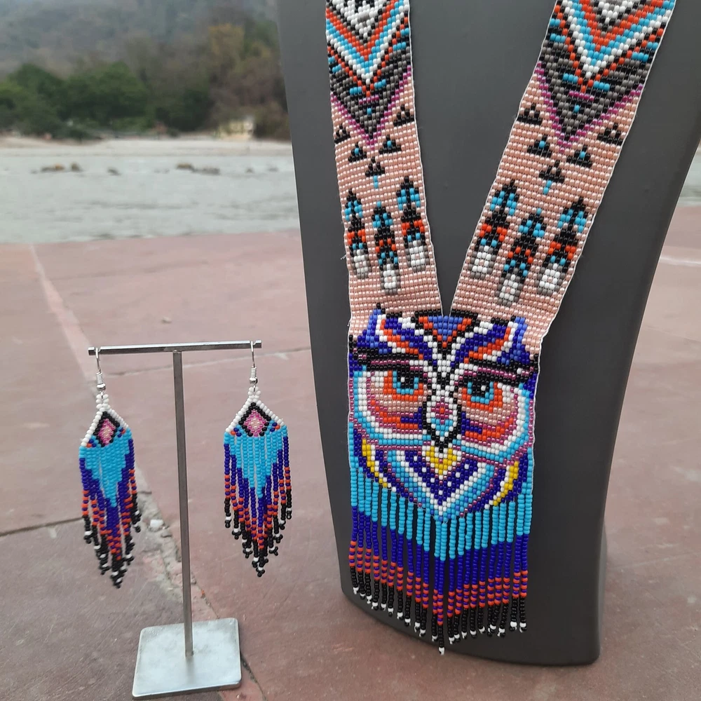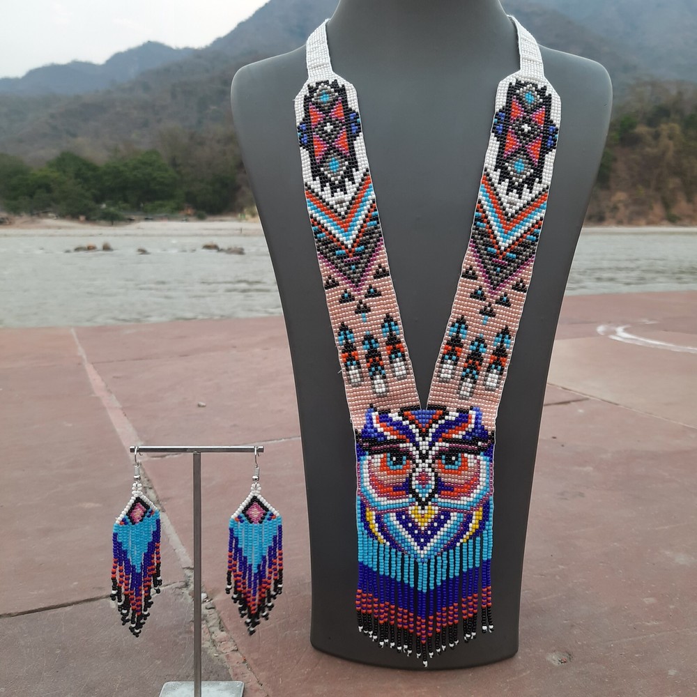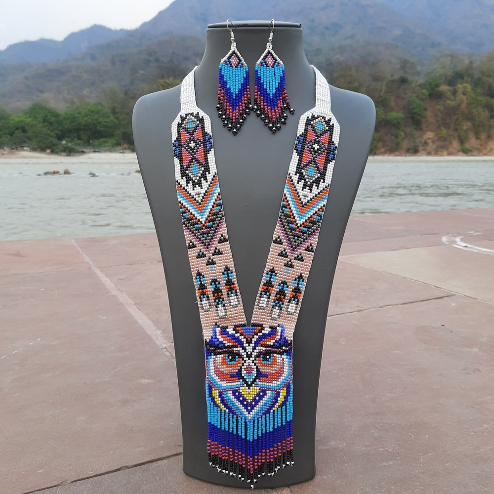 Unique Handmade Seed Bead Necklace | Boho Chic American Style Artisan Jewelry Handmade Owl Necklace Seed Bead Boho American Style Multi Strand Beaded Earrings This beautiful Handmade seed bead necklace and earring set adds a touch of boho chic to any outfit! Whether you're drawn to vintage vibes, a touch of Native American inspiration, or simply love the look of colorful glass seed beads, this seed bead statement necklace is sure to turn heads. Explore our shop to find the perfect seed bead jewelry design for you! Features Handcrafted : Unique , one-of-a-kind pieces made by skilled artisans. Durable : Long-lasting due to high-quality seed beads and sturdy construction. Versatile : Can be dressed up or down, perfect for various occasions . Affordable : Often priced lower than other types of jewelry. Lightweight : Comfortable to wear for extended periods. Easy to care for : Simply wipe clean with a soft cloth. Cultural significance : Often inspired by Native traditional folk art and craftsmanship. Specifications Specification Details Material Glass Seed Beads Necklace Length 20 inches Earrings Length 3.5 inches Color Multicolor Packaging Safe inside Bubble Paper JOIN US © The Artisanal House. All rights reserved.