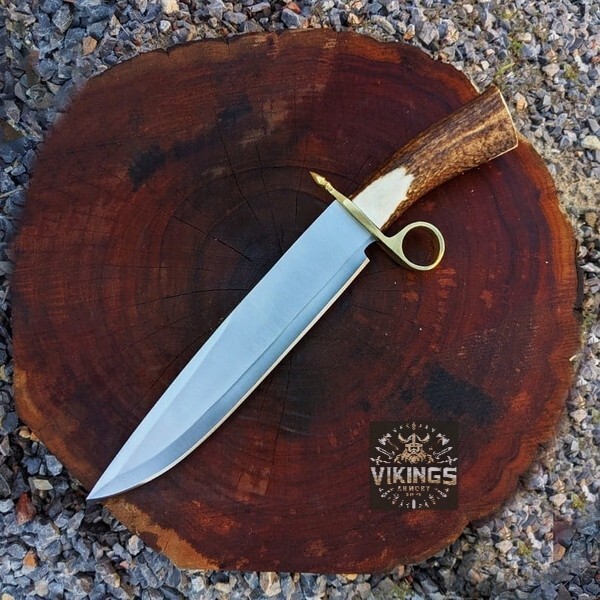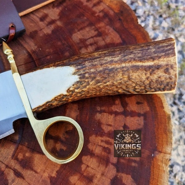 Hand-Forged Bowie Knife with Stag Handle & Leather Sheath Embrace the rugged elegance of the frontier with this handcrafted Bowie knife, a true blend of form and function. This striking blade features a razor-sharp, Hidden tang high-carbon steel construction, delivering exceptional durability and edge retention. The distinctive stag antler handle ensures a natural, ergonomic grip, while the brass guard adds a classic touch of protection and style. Perfectly housed in a custom, -stitched leather sheath.this knife is as practical as it is collectible. Whether you're a hunter, outdoorsman, or historical weapon enthusiast, this Bowie knife makes a bold statement in any collection. Specifications : Blade Material: High-carbon steel Blade Length: Approx. 9 inches to 10 inches Handle: Genuine stag antler with brass guard Purpose: Hunting, camping, display, or gifting Note : Each piece is individually handcrafted—minor variations add to the uniqueness and character of the blade. SHIPPING We use DHL or UPS normally. 5-7 Business days delivery and trackable easily. International shipping custom duty is paid by the customer, we are not responsible for the custom duties applied by your countries rules and regulations. For more queries contact us Customization Available Quality is Assure We deliver through DHL Please check Dhl Coverage area before placing order if your Address fall in DHL remote Area List You will have to pay $50 or change your Address Your satisfaction is very important for us if you have any issue contact us first before leaving any bad Review your issue will be resolved more efficiently ASAP Vikings Armory