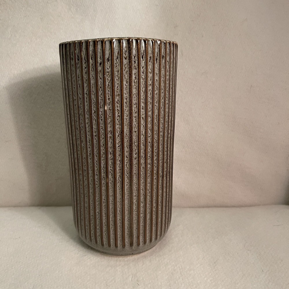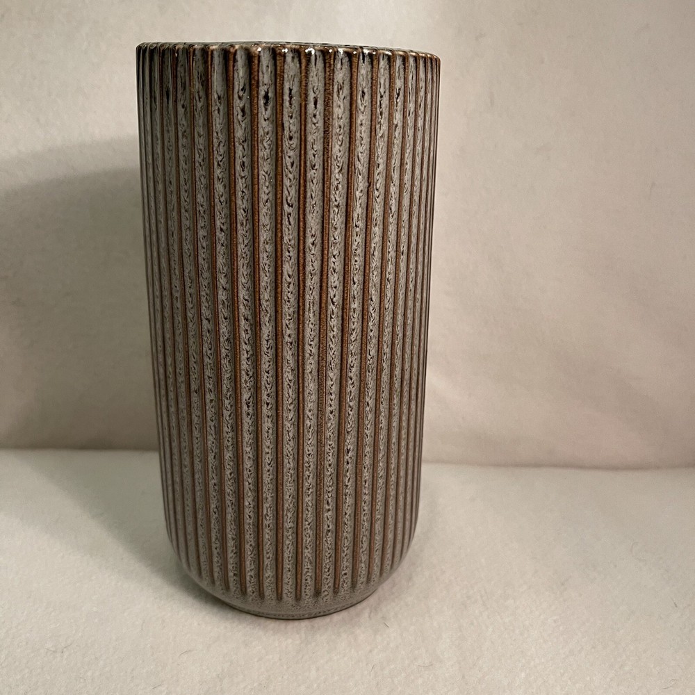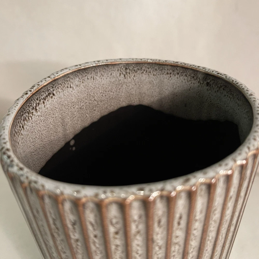 This handmade art pottery vase features a contemporary design with vertical lines in brown and grey colors. The ceramic vase stands at a height of 7.25 inches and has a width of 4 inches, weighing 1.6 lbs. It showcases a textured and decorative finish with a glossy look, perfect for adding a stylish touch to any space. This unmarked vase from the 2000s is a unique piece of art pottery, created using traditional pottery techniques. Excellent condition. No chips or cracks.