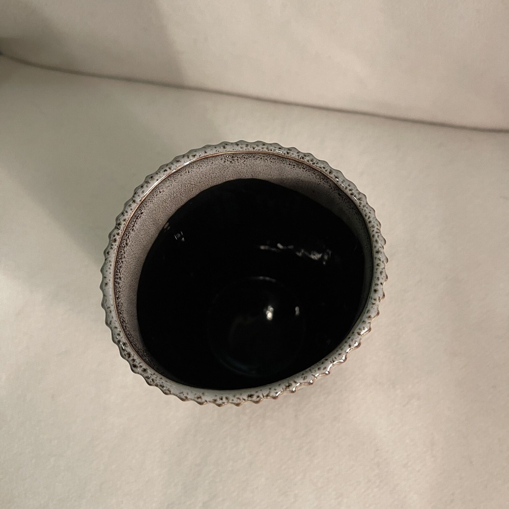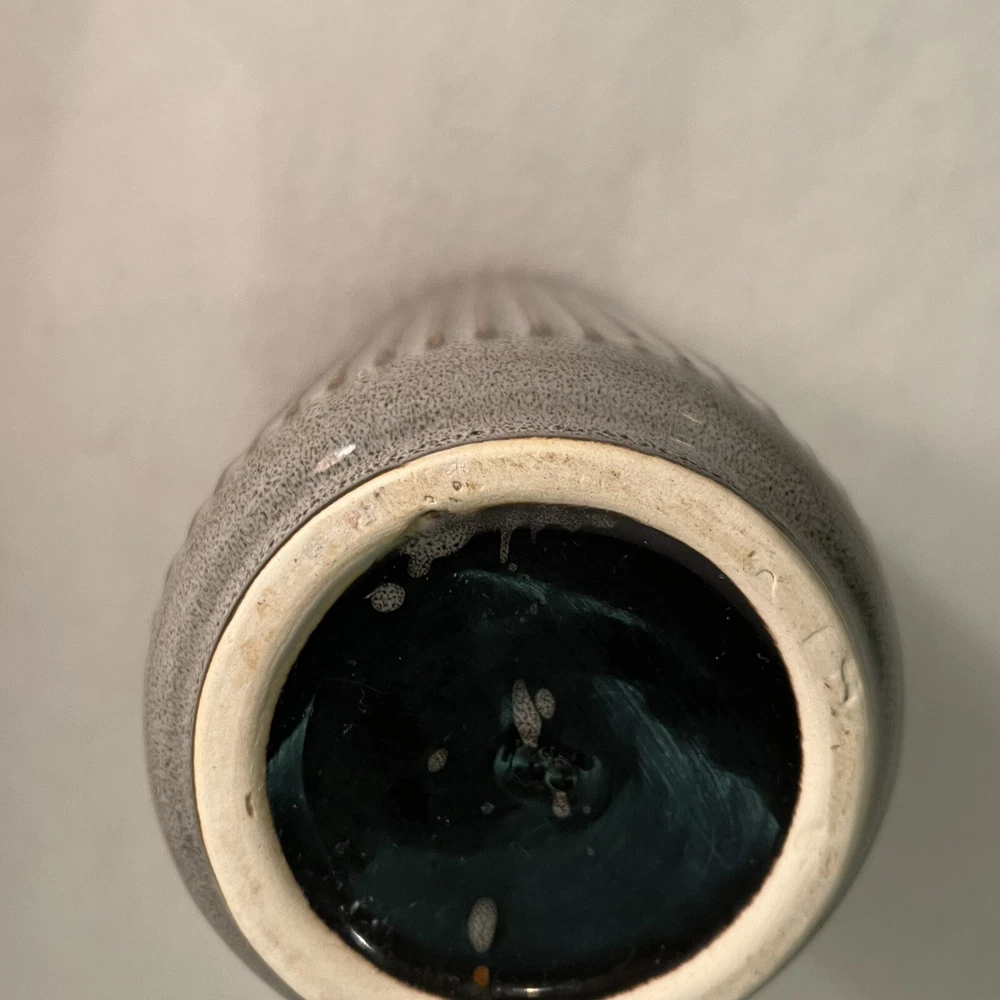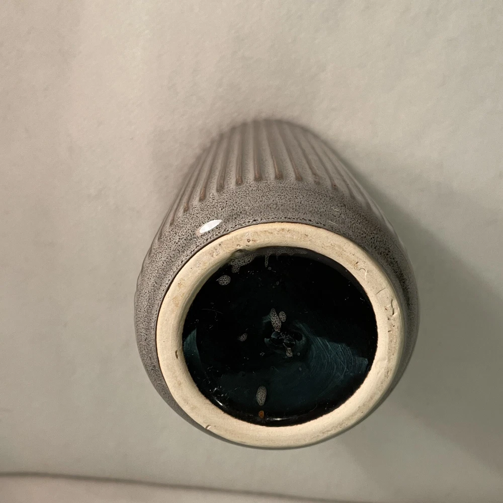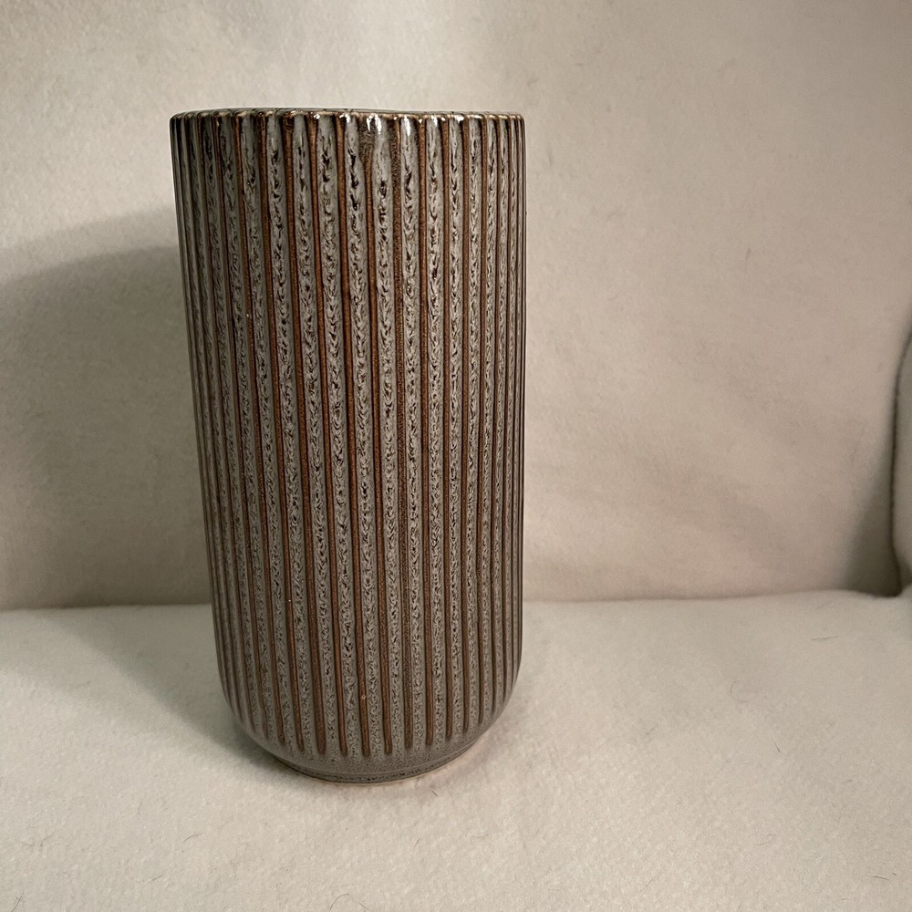 This handmade art pottery vase features a contemporary design with vertical lines in brown and grey colors. The ceramic vase stands at a height of 7.25 inches and has a width of 4 inches, weighing 1.6 lbs. It showcases a textured and decorative finish with a glossy look, perfect for adding a stylish touch to any space. This unmarked vase from the 2000s is a unique piece of art pottery, created using traditional pottery techniques. Excellent condition. No chips or cracks.