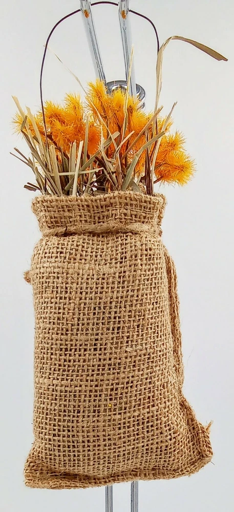 Handmade Burlap Bag with Dried Yellow Gold Flowers Wire Hanger Jute Bow 8"L USA