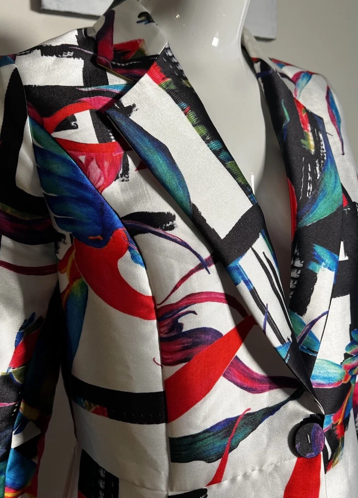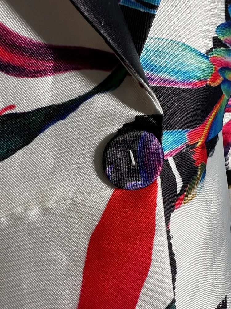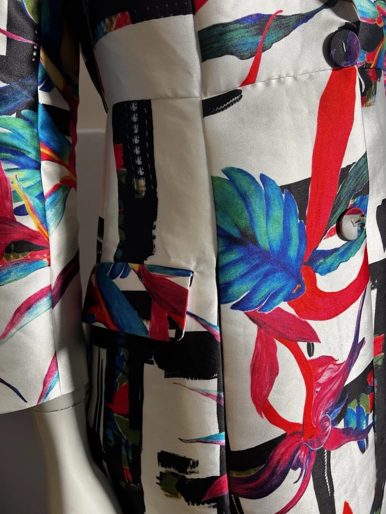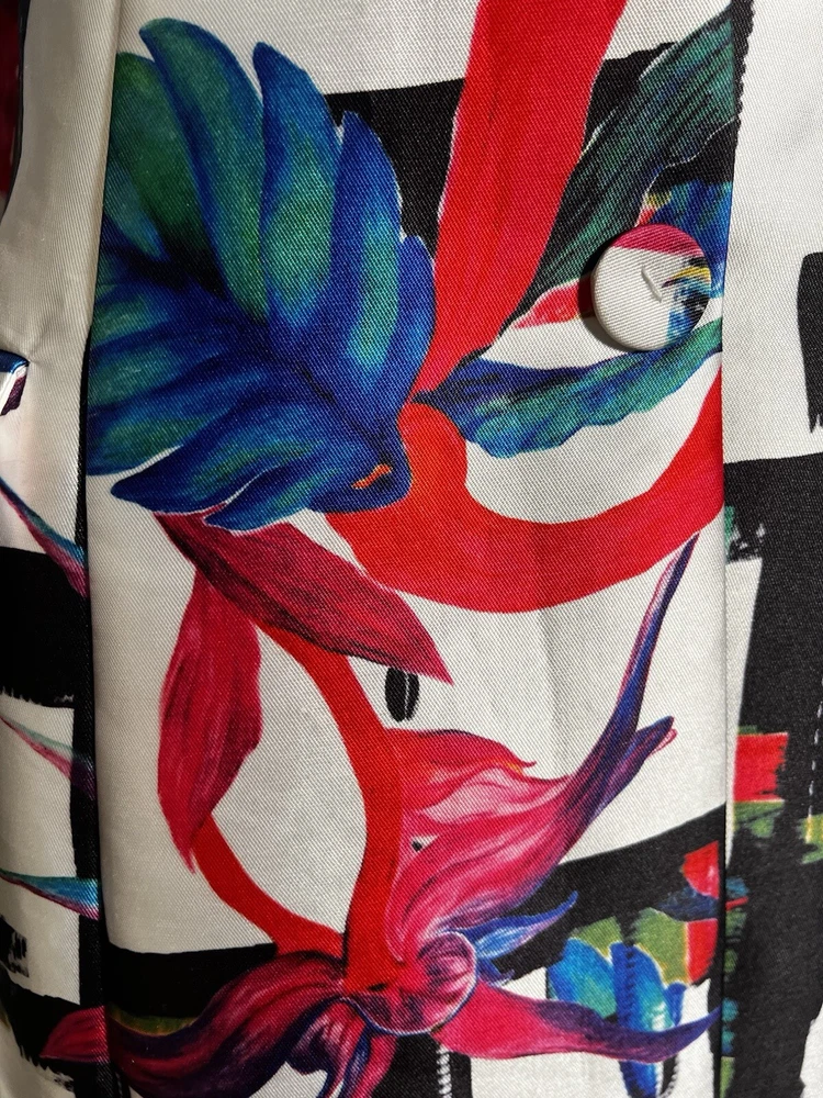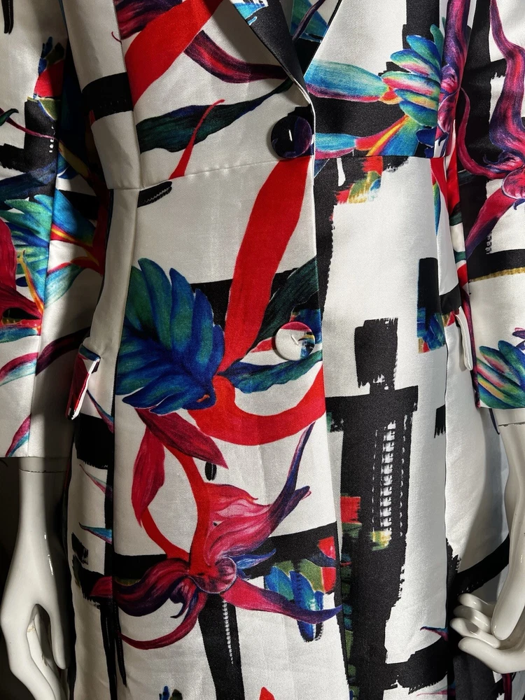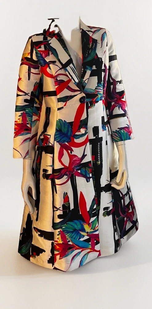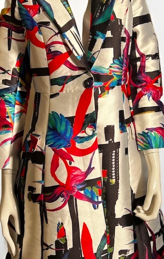 Beautiful unique trench. Bought from Manhattan Vintage with $$$ a few year ago. I love the print, shape, feel of the fabric (I am convinced that it is a natural fabric like silk taffeta) because it keeps cool in the warm days and warm in the cold weather. There are no tags or labels. It is a vintage custom made piece, unique. Fits like a size 6-8 US. It is an elegant piece, that worth the attention. Please feel free to ask any questions if you are interested in the piece.