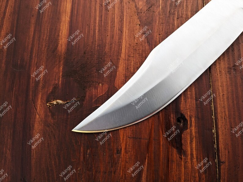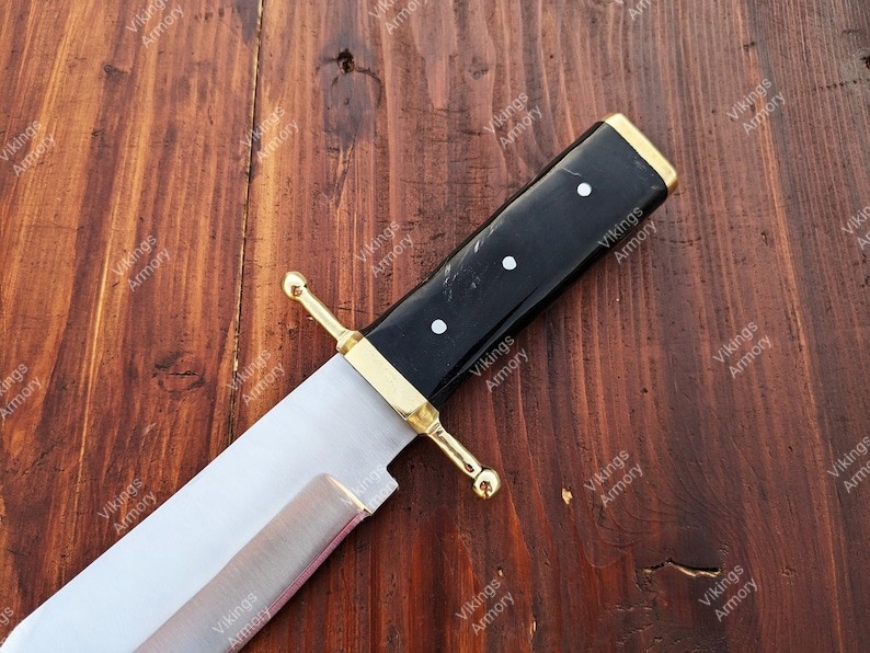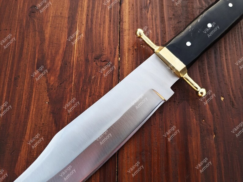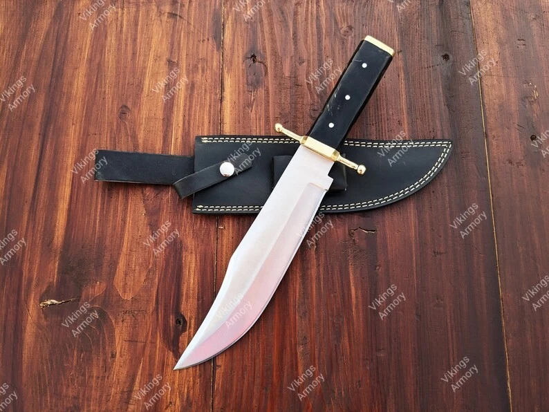Vintage Bowie Knife – Custom Handmade Smithsonian-Style Replica Handmade Antique-Inspired Bowie with Buffalo Horn Handle & Leather Sheath Presenting a beautifully crafted Vintage Bowie Knife, inspired by classic Smithsonian-style historical designs. This handmade piece combines traditional craftsmanship with timeless antique aesthetics, making it an excellent choice for collectors, outdoor enthusiasts, and gift buyers alike. Each knife is carefully handmade with attention to detail, offering an authentic vintage look while maintaining excellent balance and durability. Whether displayed in a collection or carried for outdoor use, this Bowie knife delivers both style and performance. 📏 Dimensions & Measurements Overall Length: 14.5 inches Blade Length: 10 inches Handle Length: 4.5 inches 🛠 Materials Blade Material: High-quality Carbon Steel Handle Material: Genuine Buffalo Horn, securely fitted with a Brass Guard Sheath: Premium handmade Leather Sheath (included) 🌟 Key Features Handmade vintage-style Bowie design Smithsonian-inspired antique appearance Strong and durable carbon steel blade Natural buffalo horn handle for a classic, elegant look Brass guard for added balance and safety Comes with a high-quality leather sheath 🎁 Perfect For Birthday & Christmas gifts Anniversary & wedding gifts Groomsmen & best man gifts Father’s Day gift Outdoor enthusiasts & collectors Camping, hunting, and display purposes 🧼 Care Instructions Sharpness Warning: Extremely sharp—handle with care. Blade Care: Apply a thin coat of linseed oil to a clean, dry blade to help prevent rust and corrosion. Buff off excess oil. Natural Materials: Avoid water-based products on the blade, handle, and sheath. Leather Care: Use a natural leather balm with beeswax periodically to maintain the leather handle and sheath. Sharpening: Recommended to use carborundum or diamond sharpening stones. ✍️ Custom & Personalized Orders Personalization and custom orders are welcome. If you’d like engraving, size changes, or bulk orders, feel free to message us—we’ll be happy to assist.