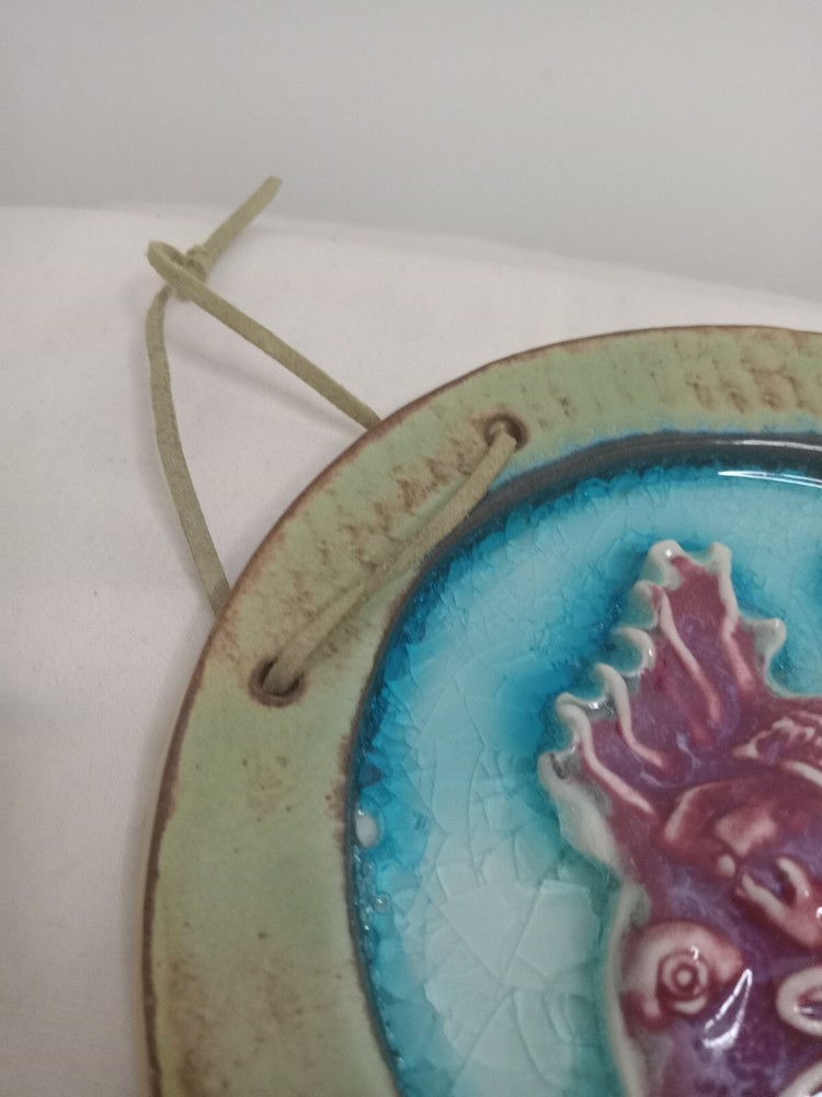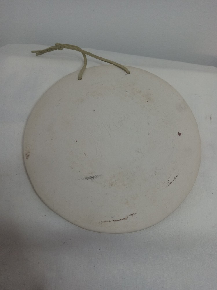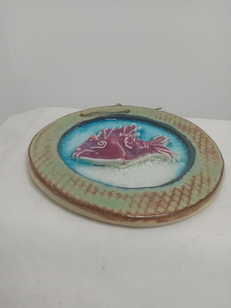 Hand Made Ceramic Clay Wall Hanging Fish Koi Circle Tile Signed Jody Braun? Approximately 15 cm (or 6") across. Signed on the back Jody Braun (as far as I can read). Very nicely glazed with a cracked effect for the water. I would guess this is a 2000s piece, although I was unable to find anything on this artist, so that is unconfirmed. A lovely addition to any collection.