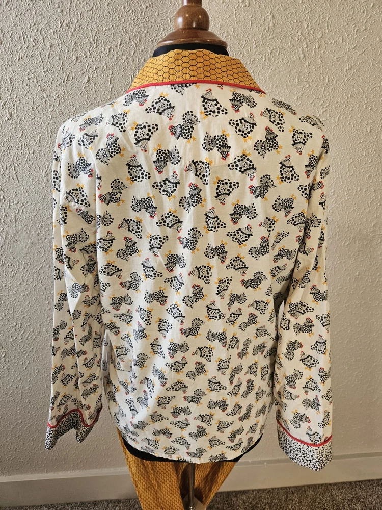 Adorable handmade women’s pajama set featuring a charming chicken print—perfect for cozy nights or relaxed mornings with a touch of farmhouse flair 🐓✨ This unique 2-piece set includes a long sleeve button-up top and matching pants in coordinating prints. The playful chicken pattern paired with mustard yellow honeycomb accents gives it a fun cottagecore, country-chic vibe. Details: Size: Women’s M/L (see fit notes below) Brand: Handmade (tagged “Made with Love by Grammy”) 2-piece set: button-up top + pull-on pants Long sleeves with contrast cuffs Chest pocket with coordinating fabric Elastic waistband for comfort Lightweight, breathable fabric Unique chicken & honeycomb print design Fit: Relaxed, comfy fit — best suited for Medium to Large depending on desired looseness. Condition: Excellent handmade condition. No noticeable stains, tears, or flaws.