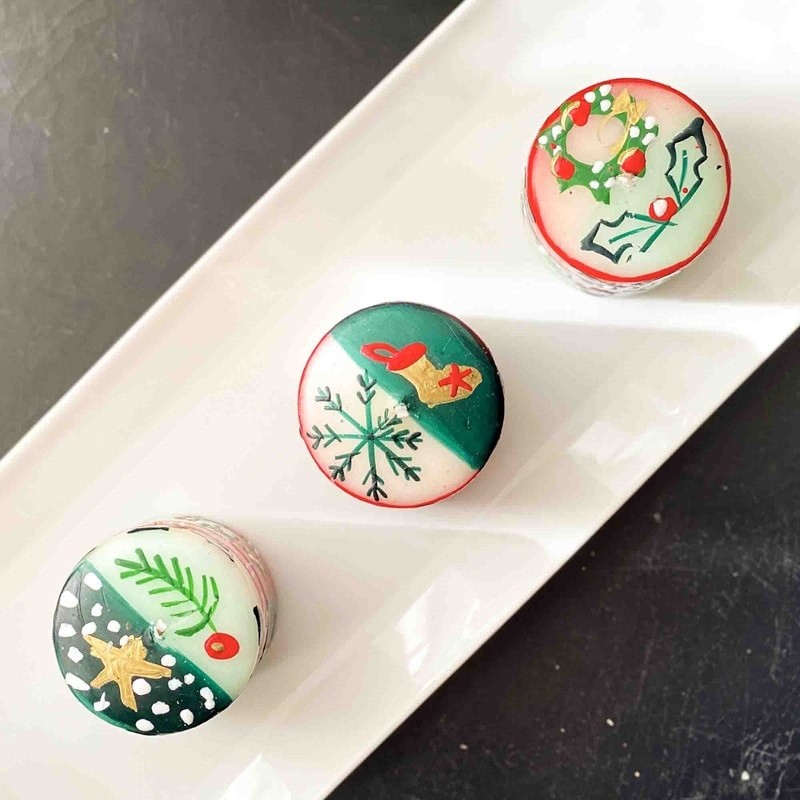This set of three candles handpainted by South African artisans arrives in a recycled cardboard gift box. Each candle is 2.75 inches tall by 2 inches in diameter. Quantity: Three (3) CandlesBrand: NobuntoMaterials: WaxScent: UnscentedColor: Red, Green, White, GoldBurn time: 17 hoursDimensions: 2.75 inches high x 2 inches in diameterStory Behind the Art:Handmade by a South African Fair Trade company that creates high quality hand-painted candles, ceramics and handcrafted greeting cards with the utmost attention to detail using mainly African inspired designs. Their mission is, in a region with high unemployment, to alleviate poverty, not only through development of industry but to be socially, ethically, and sustainably responsible. What is Worldstock? The handcrafted touch of artisan skill Free Shipping Over $49.99* Details Christmas Handmade Votive Candles with Ukhisimui Design, Set of 3 (South Africa) Product Description: This set of three candles handpainted by South African artisans arrives in a recycled cardboard gift box. Each candle is 2.75 inches tall by 2 inches in diameter. QuantityThree (3) Candles BrandNobunto MaterialsWax ScentUnscented ColorRed, Green, White, Gold Burn time17 hours Dimensions2.75 inches high x 2 inches in diameter Story Behind the Art: Handmade by a South African Fair Trade company that creates high quality hand-painted candles, ceramics and handcrafted greeting cards with the utmost attention to detail using mainly African inspired designs. Their mission is, in a region with high unemployment, to alleviate poverty, not only through development of industry but to be socially, ethically, and sustainably responsible. What is Worldstock? The handcrafted touch of artisan skill creates variations in color, size and design. If buying two of the same item, slight differences should be expected. NoteColor discrepancies may occur between this product and your computer screen. Imported