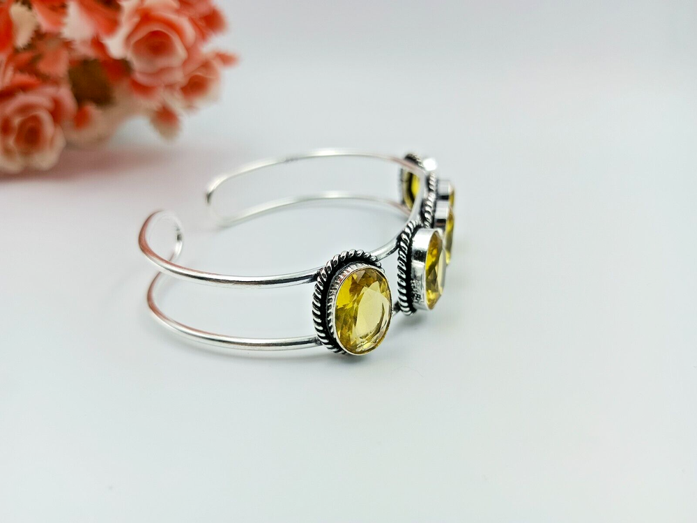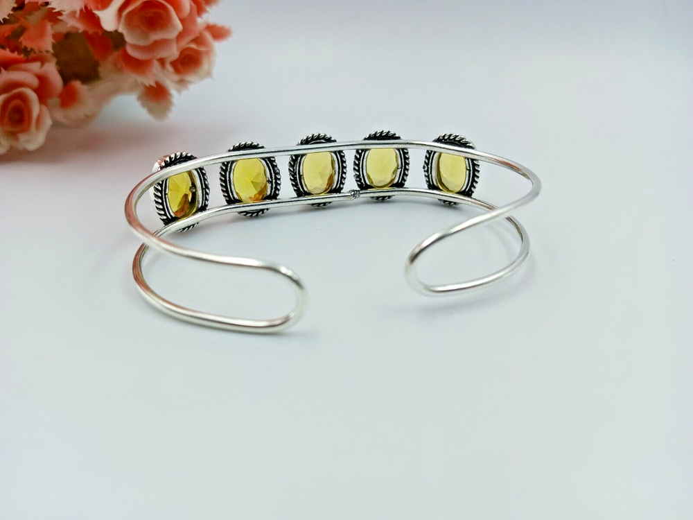 This is a handmade Citrine cuff bangle bracelet made from 925 Sterling Silver. The bracelet features a Citrine gemstone set in the Sterling Silver bangle, making it a unique and elegant piece of jewelry.
