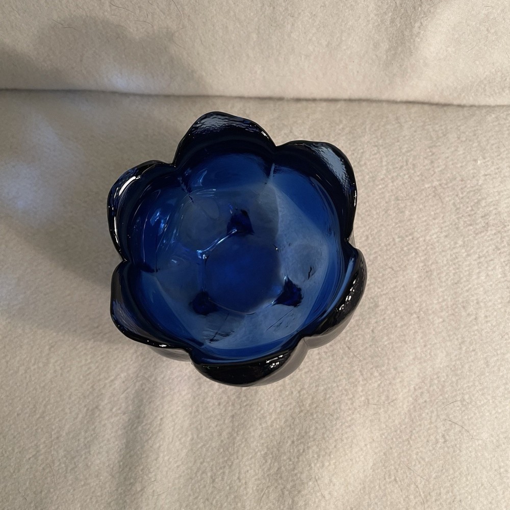 This handmade cobalt blue tulip flower shaped glass dish candle holder is a unique and decorative piece that adds a touch of Mid-Century Modernism to any space. Made in Spain in the 1980s, this original piece features a round shape and a vibrant blue color. The intricate design and handmade quality make it a standout collectible for those who appreciate handmade items and vintage decor. This candle holder is not only functional but also adds a stylish and artistic flair to any room. Excellent condition. No chips or cracks.