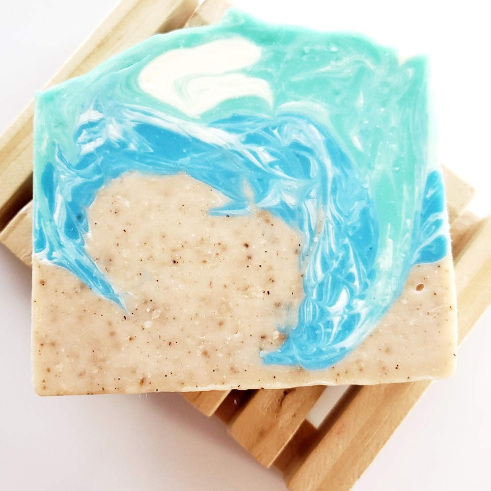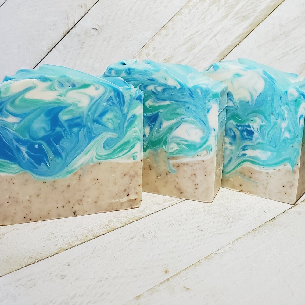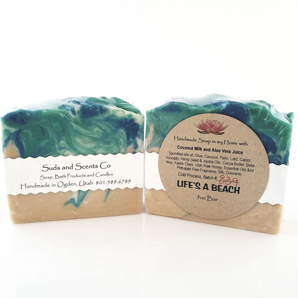 LIFE'S A BEACH smells of Sea Salt, Moss, Jasmine and Mandarin. A 5oz Body bar Handmade in the USA with Organic and Food Grade Ingredients: Coconut Milk, Aloe Vera Juice, Olive Oil, Coconut Oil, Lard, Palm Oil, Castor Oil, Avocado Oil, Cocoa Butter, Shea Butter, Hemp Seed Oil, Beeswax, Kaolin Clay, Jojoba Oil, Colorants. LIFE'S A BEACH was made with the Blues and Greens from the Ocean - with your toes in the Sand. Formulated to be a Moisturizing Body Bar for Him or Her. This is cold process soap, made in small batches with food grade and/or organic ingredients, formulated to provide you a creamy lather with extra Shea and Cocoa butters for Hydration and Moisture. Each batch is unique; Because of this your bar may differ slightly from the pictures above.
