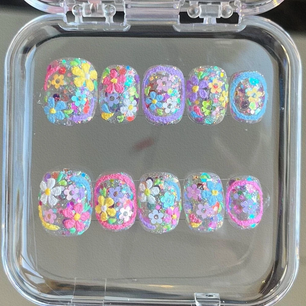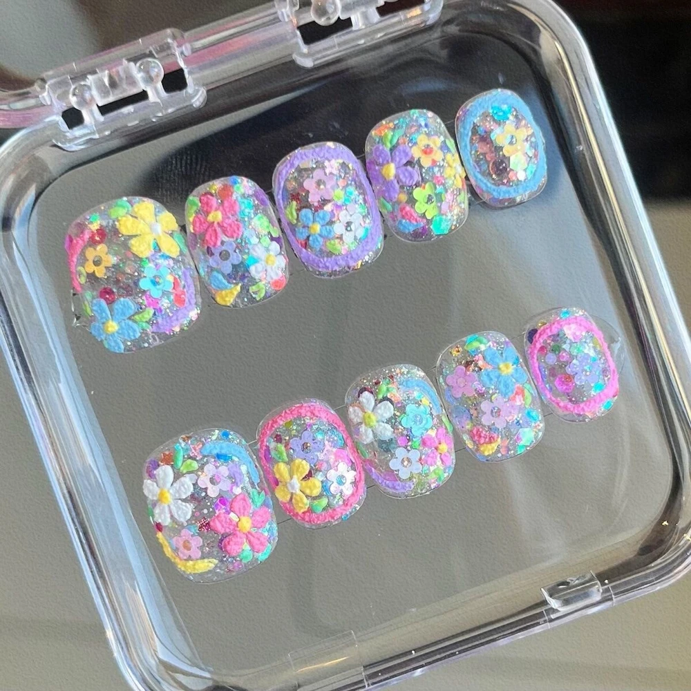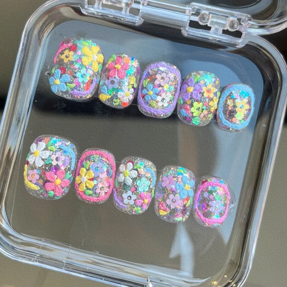 Handmade Colorful Flowers False Nail Short Squoval Press on Nail for Nail Art