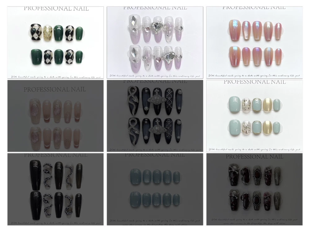 Each set is handmade according to size.Please understand some orders will take longer to ship out.Thanks for support and patience! Please under feel free to contact me with any questions,comments,or concerns!! Handmade Press on Nails Application Steps: (1)Start by preparing your nails: remove any old polish remove any dead skin away from cuticle area to ensure that your nail has a bigger area for the sticker to properly fit for better adherence when nail is applied. (2) Gently file the top surface of you nail to remove any residue prior to applying the Press on Nails. (3) Be sure your nail surface is clean and dry. (4) Select the suitable size of adhesive sticker for your fingernail before you place the sticker (5) Gently remove the top protective layer on the adhesive sticker and place on the press on nail (6) Align the press on nail with your natural nail starting at the cuticle and pressing down towards the tip of your natural nail please remember to hold press on nail for a minimum of 30 seconds to ensure there is no air space between press on and natural nail. Lastly, Enjoy Your Beautiful Nails!!! Handmade Press on Nail Removal Steps: Immerse hand in warm soapy water for a minimum of 2 minutes this will assist in removing the glue sticker while maintaining the condition of the press on nail for re-use. Notes on Handmade Production: Since it is 100% hand customized, especially some complex patterns, there is no way to be the same as the pictures shown. We hope you can understand, thank you for your support, and we will continue to work hard! We have been striving to provide products that satisfy our customers!!!