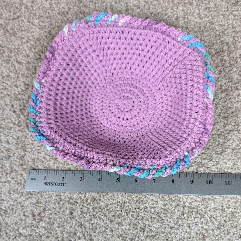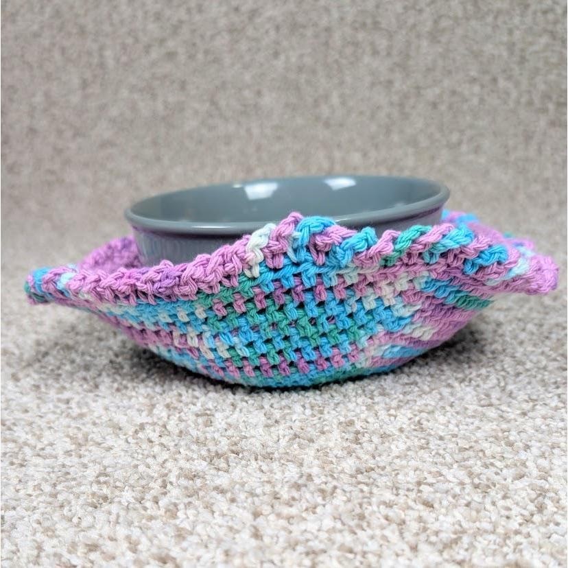Bowl Hot Pad - Orchid/Beach Ball 2 layer crocheted bowl cozy 100% Cotton 10" wide at top x 4" tall, 4" diameter on bottom Works great as a pot holder for hot bowls straight from the microwave From Smoke Free/Cat Friendly Home - Cats are not allowed to play with yarn Keywords: crochet bowl cozy, handmade bowl cozy, reversible bowl cozy, hot pad, bowl holder, purple bowl cozy, blue bowl cozy, unique kitchen decor, handmade kitchen, gift idea, housewarming gift, table decor, kitchen accessory, bowl mat