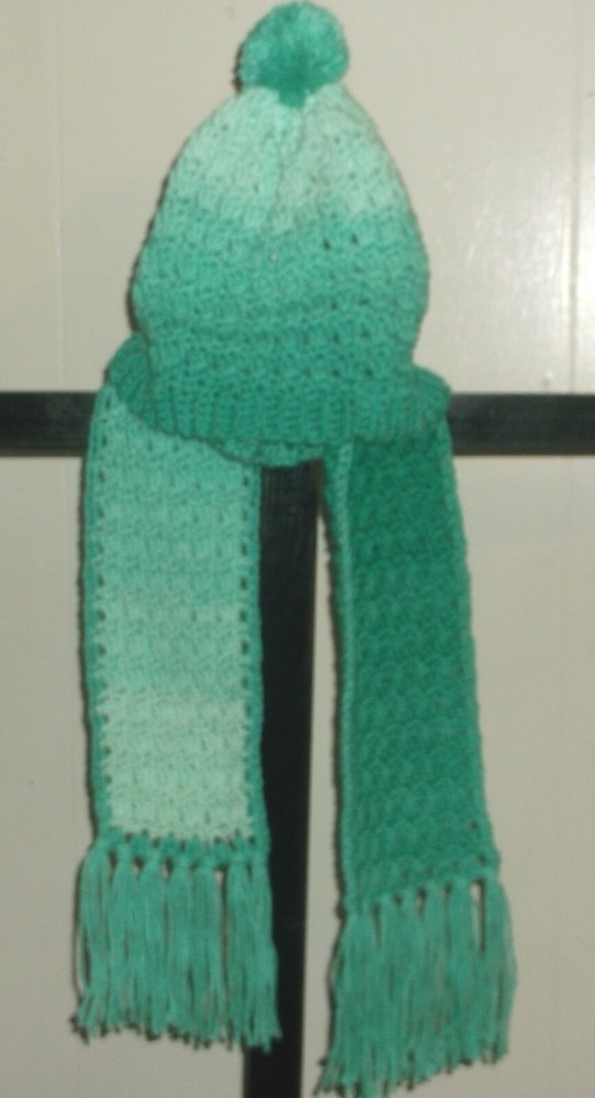 THIS IS ONE NEWLY HANDEMADE CROCHET SCARF WITH MATCHING HAT THIS SET IS DONE IN RED HEART OMBRE YARN THE COLOR IS DEEP TEAL. THE SCARF MEASURES 60 INCHES LONG INCLUDING FRINGE AND IT IS 6 INCHES WIDE THE HAT MEASURES 22-24 INCHES AROUND AND 10 INCHES DEEP.