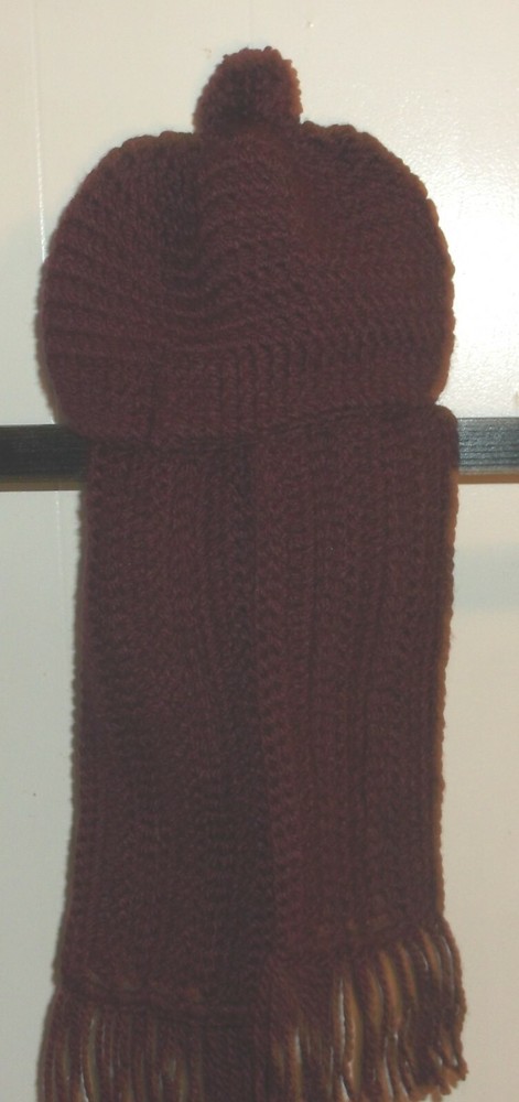 THIS IS ONE NEWLY HANDEMADE CROCHET SCARF WITH MATCHING HAT THIS SET IS DONE IN PREMIER CHUNKY YARN THE COLOR IS WINE. THE SCARF MEASURES 74 INCHES LONG INCLUDING FRINGE AND IT IS 6 INCHES WIDE THE HAT MEASURES 25 INCHES AROUND AND 9 INCES DEEP BEFORE POMPOM.