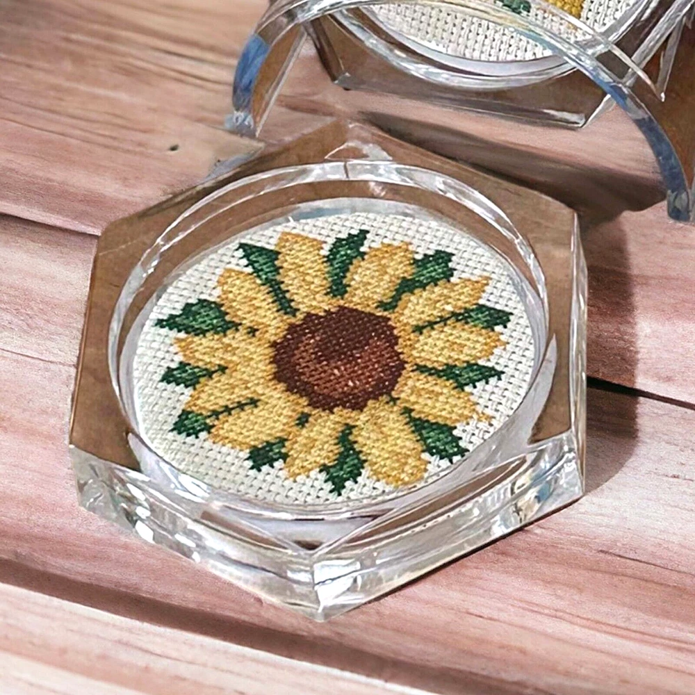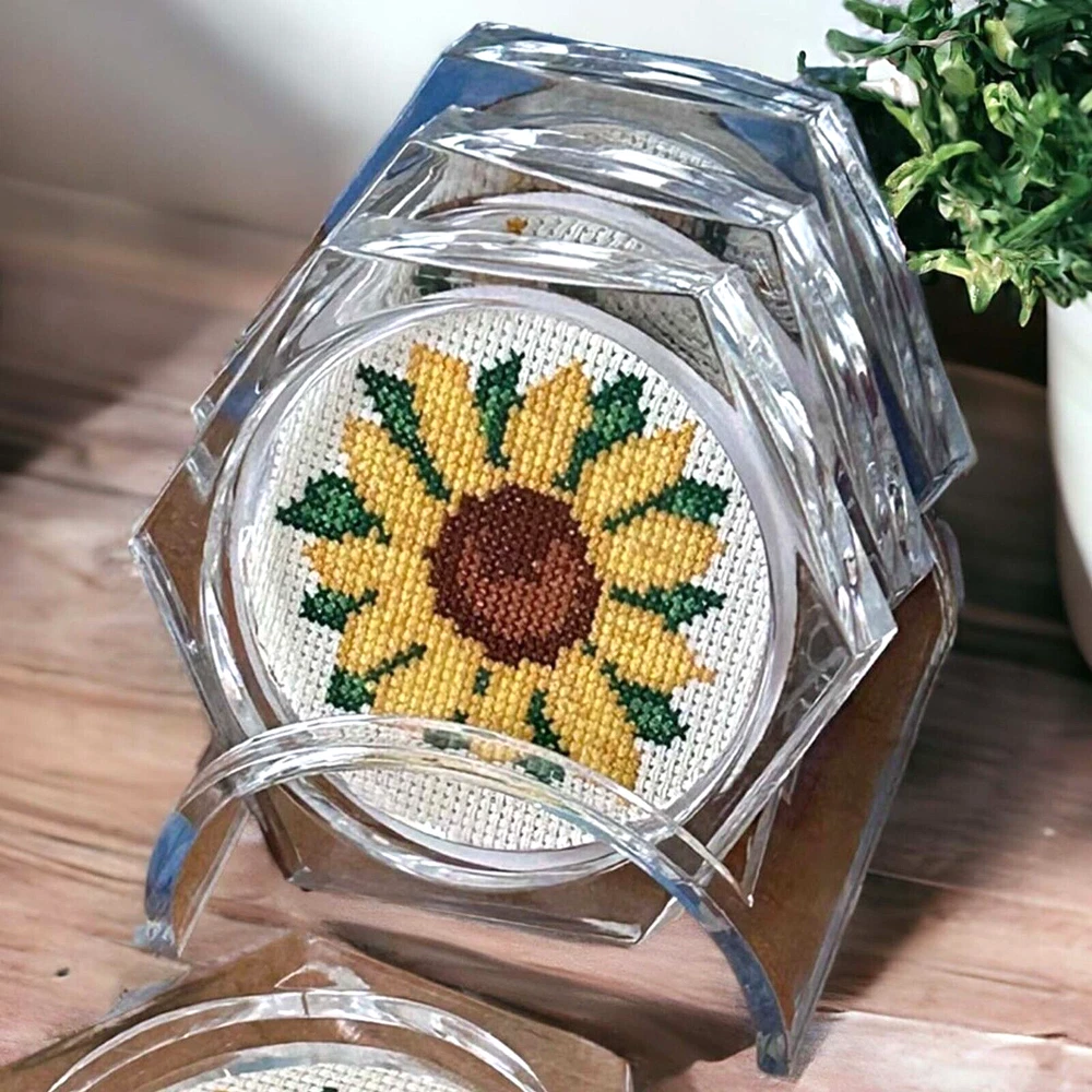 Add a touch of sunny elegance to your table setting with these Handmade Cross Stitched Sunflower Coasters. The set includes four coasters, each adorned with a beautiful sunflower design in yellow cross stitch embroidery. These coasters are perfect for protecting your surfaces while adding a pop of color and charm to your decor. The set also includes a handy holder for easy storage and display. These coasters are ideal for any occasion, from a casual gathering to a formal dinner party. They make a great gift for anyone who loves cross stitch or sunflowers. Measuring at 4" x 4", these coasters are the perfect size for any drink and are sure to impress your guests.