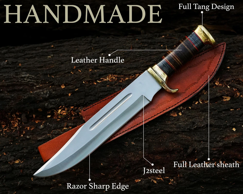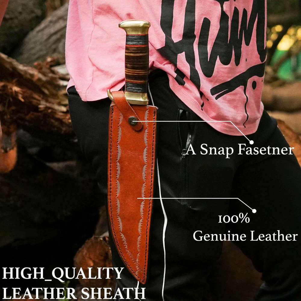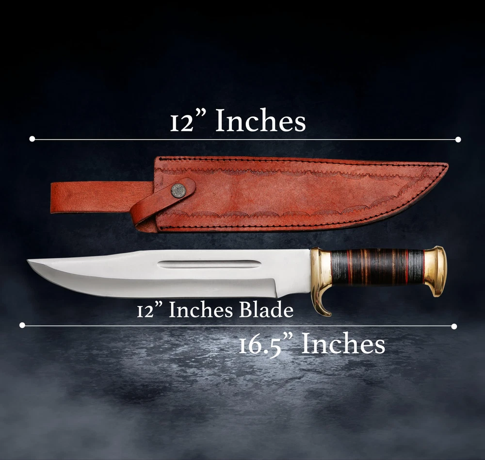 Perfect Hunting Knives For Outdoor Activities Our crocodile dundee knife With Sheath EDC knife has been Designed For Extraordinary Performance. This survival knife with a sheath Is All You Want. Incredibly Valuable For Hunting, Cleaning, Fishing, Setting Up Camp, Woodcutting, Climbing, Sports Games And Outside Endurance Requirements Fixed Blade Hunting knives Specification fixed blade knife Overall Length Of 16.5 Inches; Blade Length Of 11 Inches; Handle Length 5.5 Inches; Knife Weight 950 Grams. Bowie Knives Handle Material The Pakkawood And Leather Handle Of The Bowie Knife With Sheath Is Handmade And Non-Slip. The Pakkawood Handle Is Textured For Adding Grip And Less Slip While Working. The Whole Material Of The Handle Is Natural. Fixed Blade Knives With Sheath The Pure Leather Sheath Of This Amazing Professional Large Knife Is Made Of Prime Quality Thick Cow Skin To Ensure Excellent Manufacture. The Durable Double Stitching With Strong Thick Threads, In Combination With The Elegant, Standard Leather Knife Sheaths Host Your Precious Small Fixed-blade full tang knife Buy With Confidence We Take Pride In Our Hunting Knives With Sheaths And Back Them With A Reliable Policy. Care A Hunting Knife Is Made From Stainless Steel So To Prevent Corrosion Apply Oil After Using The Camping Knife. Package Includes 1 X Bowie Knife With Pakkawood/Leather Handle 1 X Knife With A Sheath For Belt ✅[HUNTING KNIVES FOR MEN SPECIFICATION]: Fixed Blade Hunting Knife With Sheath Overall Length Of 16.5 Inches; Blade Length Of 11 Inches Handle Length Of 5.5 Inches ✅[PREMIUM COMPOSITION] Bowie Knife Full Tang Handle Crafted With Leather And Pakkawood, Ensuring A Comfortable Grip. High-quality Stainless Steel For Exceptional Strength, Edge Retention, And Corrosion Resistance. ✅[KNIFE WITH LEATHER SHEATH] Our Fixed Blade Bowie Knife Comes With A Genuine Leather Sheath, Providing Superior Protection Against The Elements And Ensuring Safe And Convenient Carrying During Outdoor Excursions ✅[USAGE AND APPLICATIONS]: Designed For Hunting, Survival, Camping, Bushcrafting And Other Outdoor Tasks, This Razor Sharp Bowie Knife Is Suitable For Any Use. Its Razor-sharp Edge Make It An Essential Tool For Wilderness Exploration Trips. ✅[Best Gift] Bowie Knife A Timeless And Versatile Tool For Outdoor Enthusiasts And Collectors, Perfect For Birthdays, Anniversaries, Christmas, Wedding, Graduations, And Holiday Celebrations.