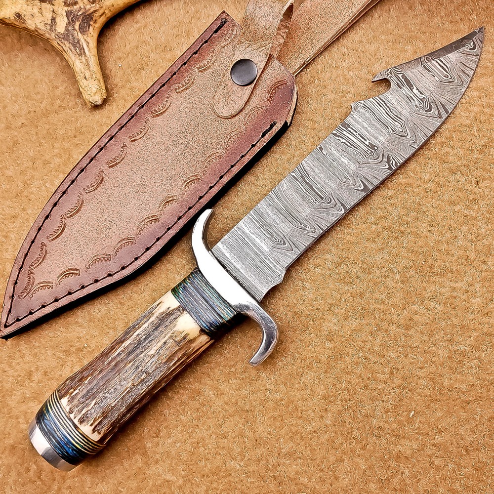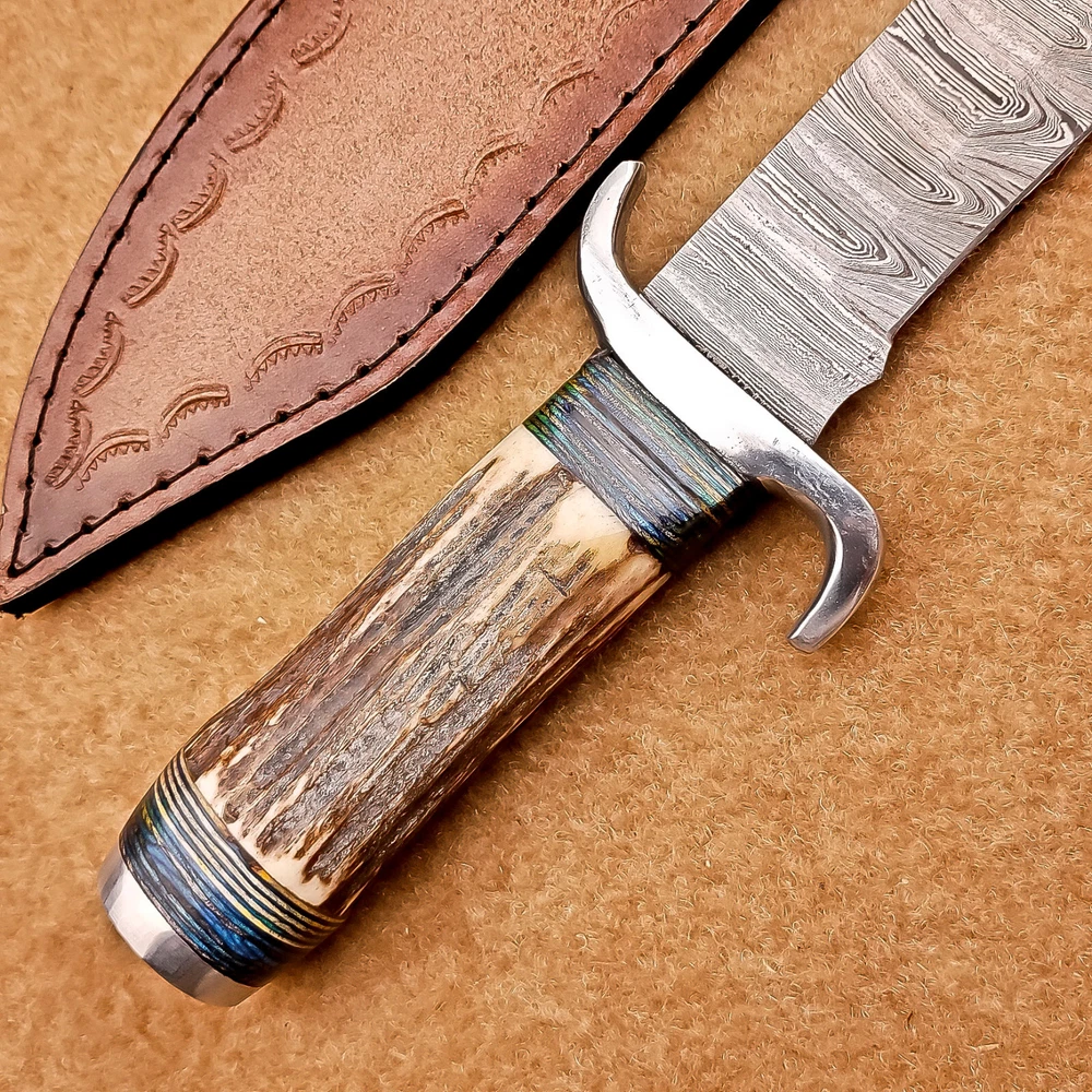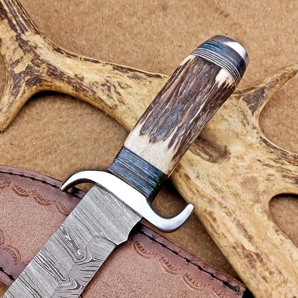 BEAUTIFUL Handmade Damascus Hunting Knife, Bowie Knife, Camping Knife, Specifications: Overall Length: 12.00" Blade Thickness: ~4 mm Blade Material: Damascus Steel Handle Material: Stag horn with hand casted steel bolster. Includes: Leather sheath Blade Craftsmanship: Blades are made from 1095 & 15N20 High Carbon Tool Steel with over 256 layers and a hardness of 58-60 HRC for durability and sharpness. Spine of the blade tang has excellent fire work. Care Instructions: Sharpen with a Diamond Wet Stone at a 20-degree angle. Clean with soap and water, dry thoroughly, and apply gun oil. Store away from the sheath to prevent rust. Important Notes for Buyers: Verify your country’s import regulations before purchase. Customs duties, if any, are the buyer’s responsibility. Shipping & Returns: Free shipping included. 14-day return policy applies. Contact Us: Message us anytime. We respond within 24 hours.