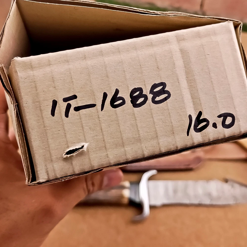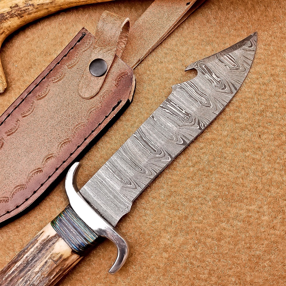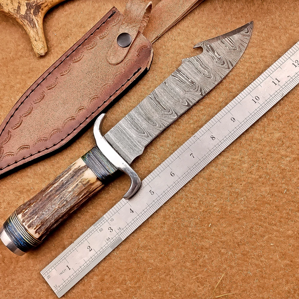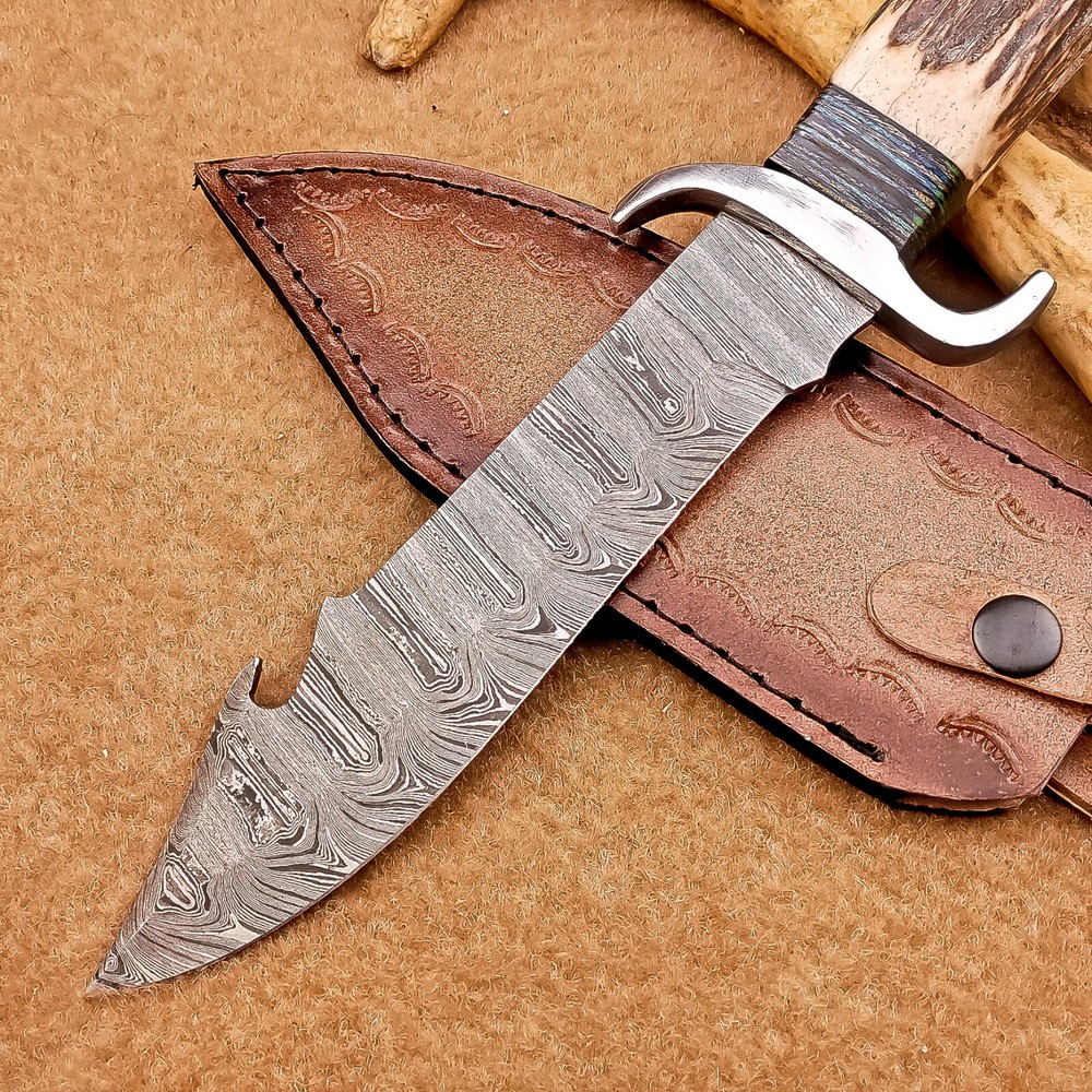 BEAUTIFUL Handmade Damascus Hunting Knife, Bowie Knife, Camping Knife, Specifications: Overall Length: 12.00" Blade Thickness: ~4 mm Blade Material: Damascus Steel Handle Material: Stag horn with hand casted steel bolster. Includes: Leather sheath Blade Craftsmanship: Blades are made from 1095 & 15N20 High Carbon Tool Steel with over 256 layers and a hardness of 58-60 HRC for durability and sharpness. Spine of the blade tang has excellent fire work. Care Instructions: Sharpen with a Diamond Wet Stone at a 20-degree angle. Clean with soap and water, dry thoroughly, and apply gun oil. Store away from the sheath to prevent rust. Important Notes for Buyers: Verify your country’s import regulations before purchase. Customs duties, if any, are the buyer’s responsibility. Shipping & Returns: Free shipping included. 14-day return policy applies. Contact Us: Message us anytime. We respond within 24 hours.