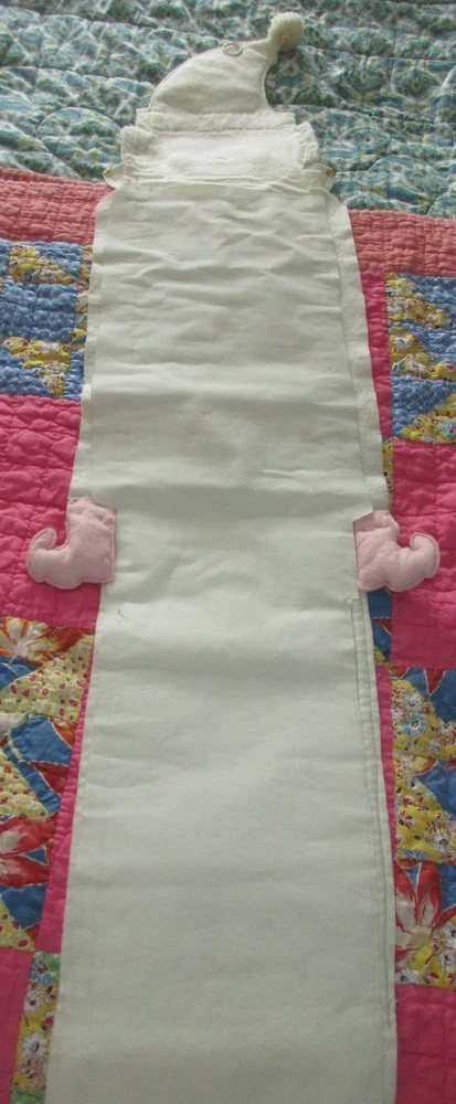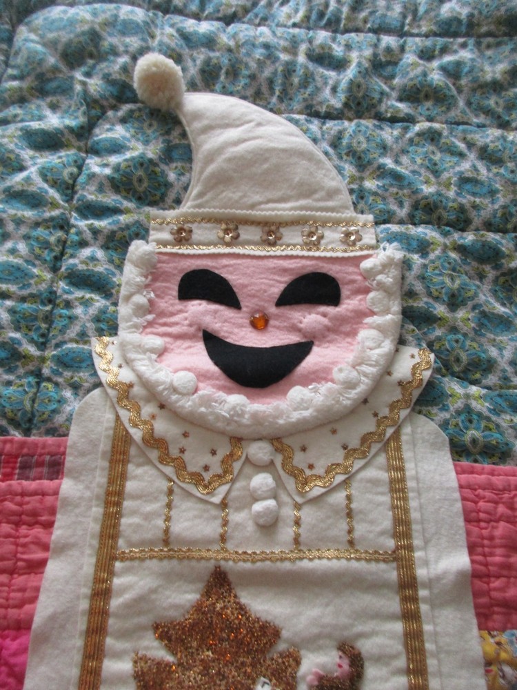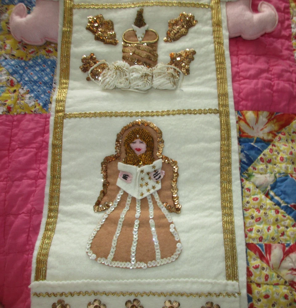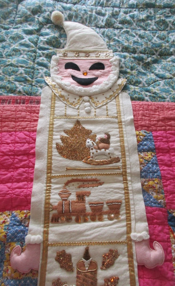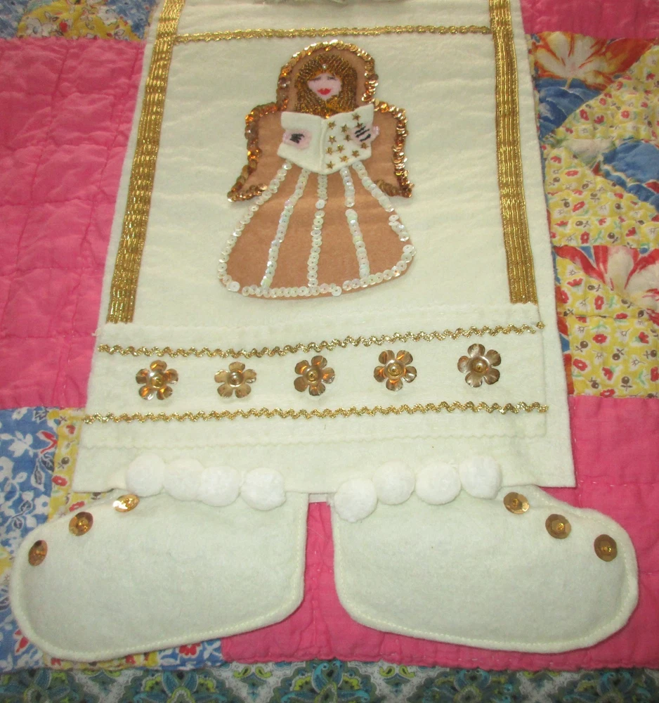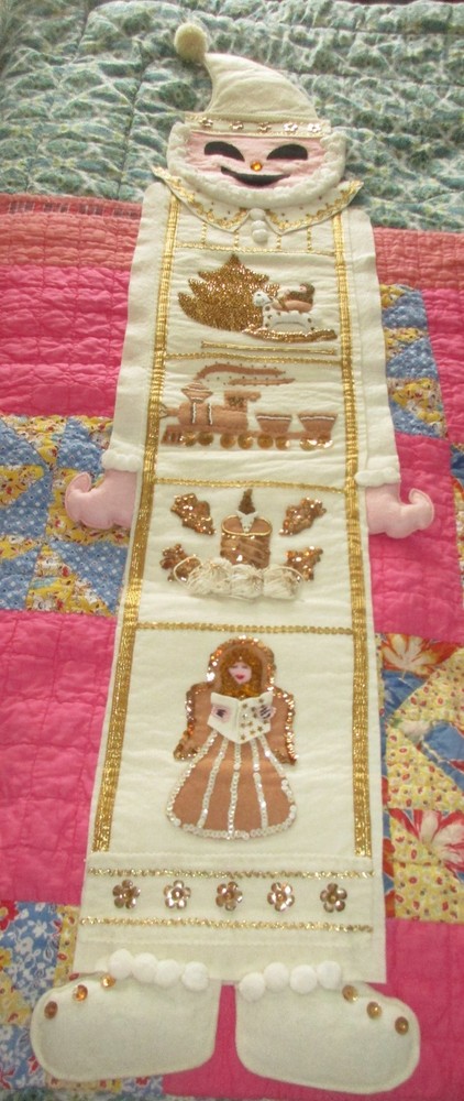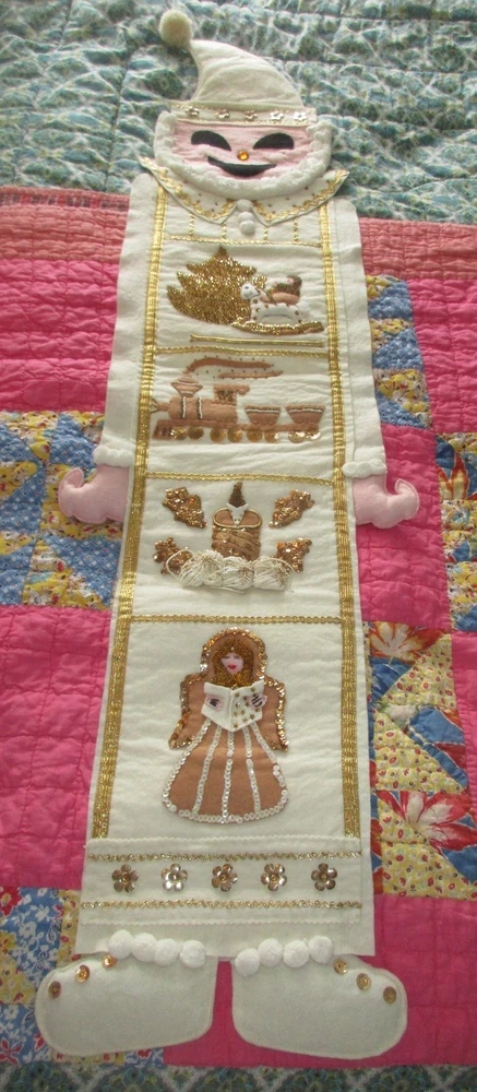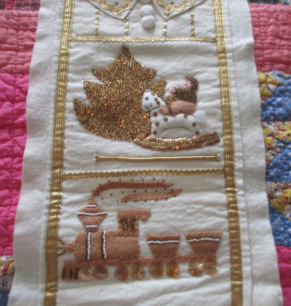 Christmas Card Wall Hanging Handmade - Felt with gold rick rack, sequins & gold beads - A ton of work went into the bead & sequin work on this piece The gold Christmas tree is made of star sequins & small round beads Age unknown - Measures 50" long by 11" wide There are 4 Card pockets which are under the Gold Tree, Train, Candle & Angel There may be a few sequins missing & a few tiny dingy spots in the white felt but overall it is in excellent condition