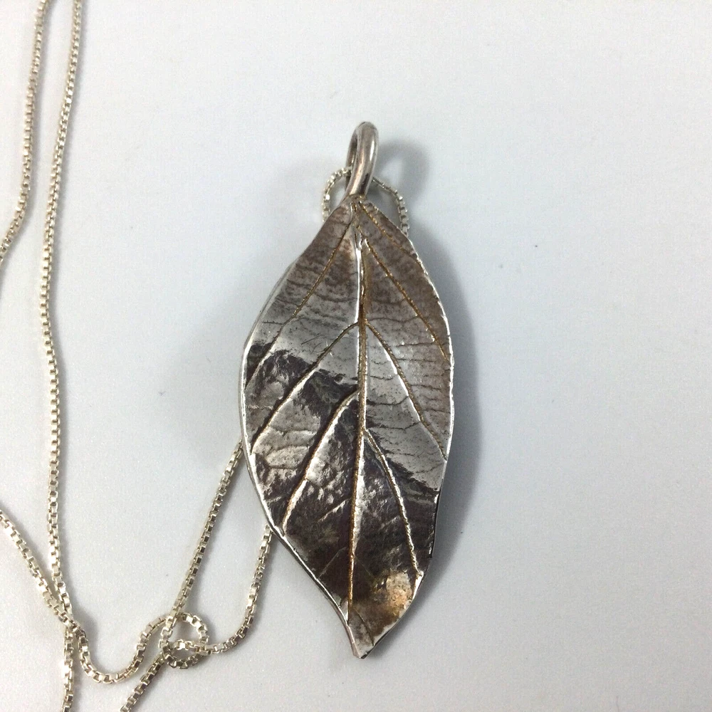 Handmade Fine Silver Leaf Pendant Sterling Silver 18" Box Chain Necklace No 2. Handmade by artist, imprint of the real leaf. One of a Kind. Pendant is made of fine silver clay, 99.9 % silver. Pendant is 1 3/4" large. No mark on the pendant. InvN/G/15/2 FS