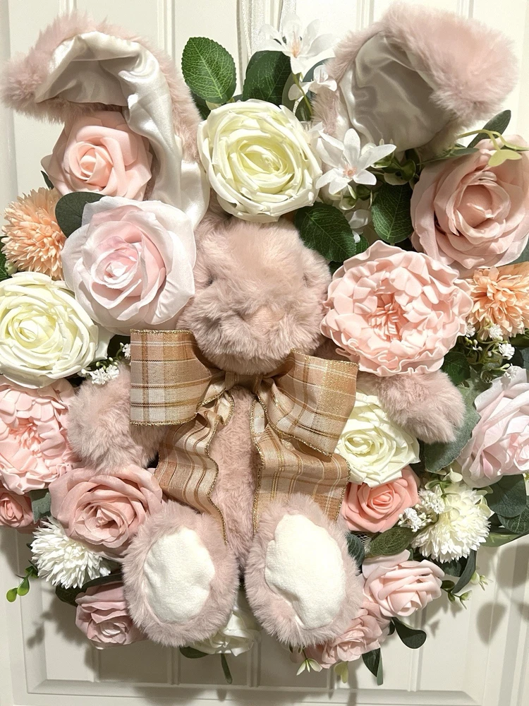 About 22 inches across (this accounts for the spray), 5 inch-deep (6” with ears) door or mantle. Has mesh back to add to fullness. Spring themed w/ vibrant colored silk/ foam flowers. An adorable plush bunny with a rose golden bow is embedded within the flowers. This wreath is built on an 14 inch frame. Perfect for decorating your home for Easter/ Spring. Wreath made in a smoke free environment. Wreath can be displayed either indoors or outside. However, for optimal durability please avoid direct sunlight and harsh elements. Ships in a sturdy box that will be closer to frame size. On arrival you may need to fluff ribbons and bows. W6Sg14D213499