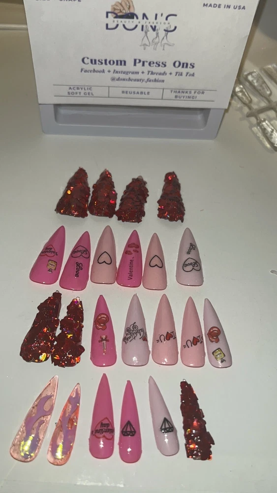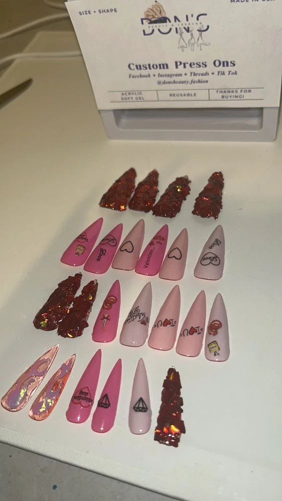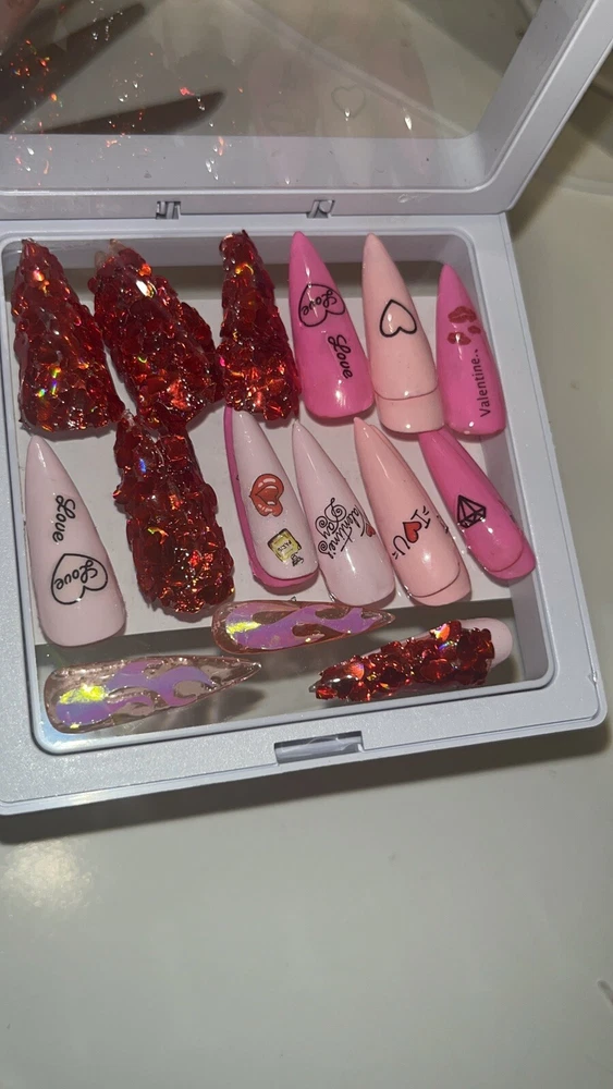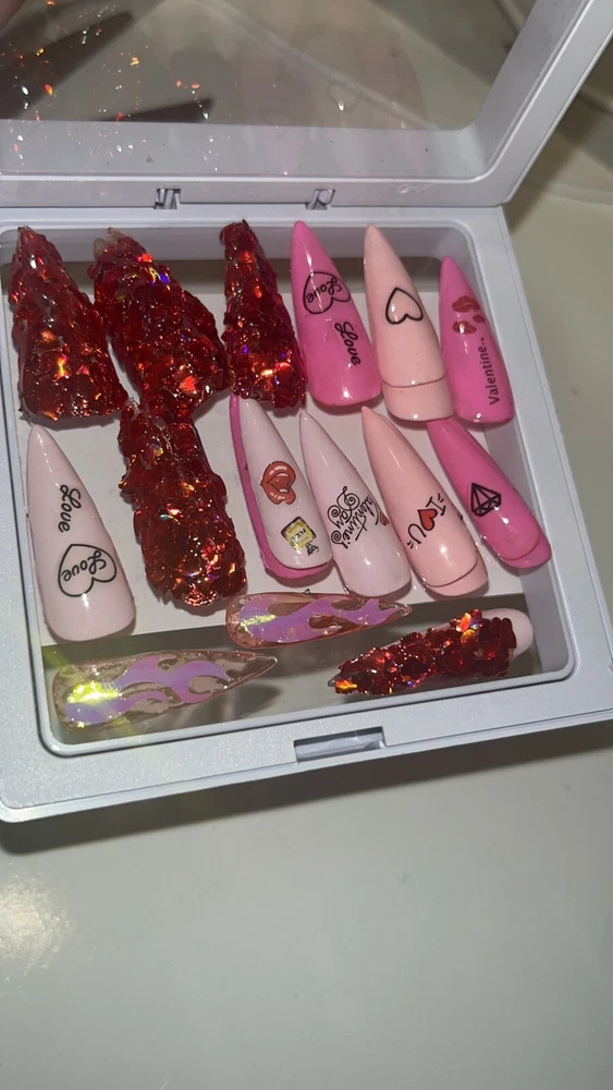 Super cute for the day of love. We're obsessed with this VDay set! This set was handmade and designed by yours truly. Nails are stilleto shaped with various kisses, diamonds and Valentines Day wording . Each set comes with glue, a cuticle stick, and an Emory board. This set has 23 nails! The sizes in this set are as follows: Size 0: 4 nails Size 1: 5 nails Size 4: 5 nails Size 6: 5 nails Size 8: 4 nails =23 nails ATTENTION: Nails are made with poly gel. These nails are highly flammable. Please advise and avoid purchasing if you have a known allergy to poly gel and the chemicals in most nail polishes.