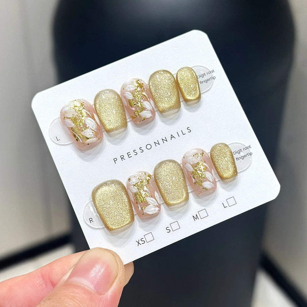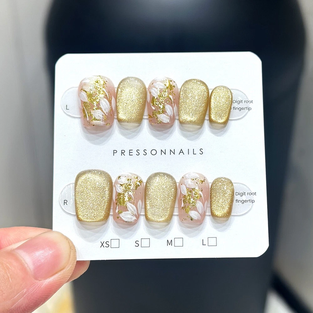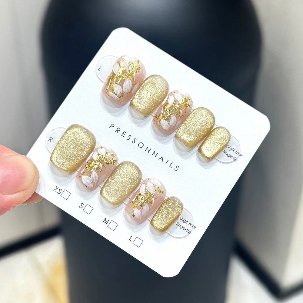Handmade Gold Shimmer Flowers False Nail Short Coffin Press on Nail Nail Art