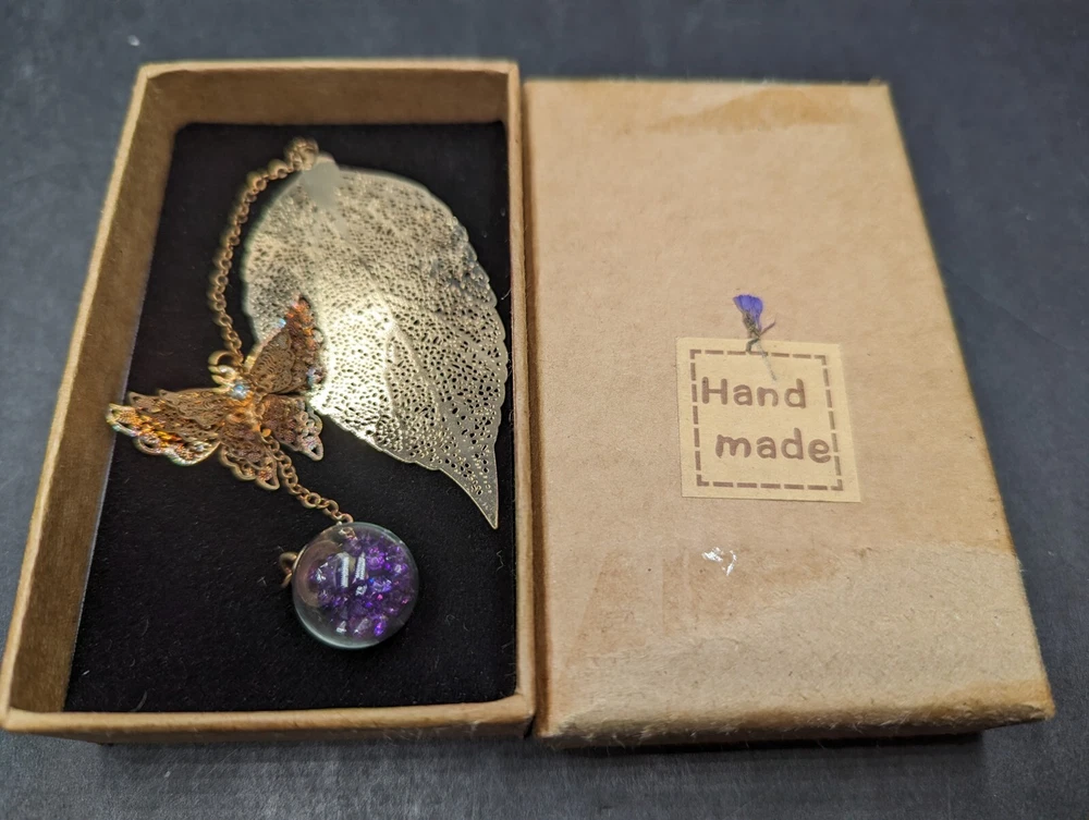 Handmade Gold Tone Metal Leaf Butterfly Glass Ball w/Purple Rhinestone Bookmark. Pre-owned but I don't think this was ever used. This bookmark is very pretty. There is a gold tone leaf, a copper-colored 3D Butterfly with a rhinestone in the center and a clear glass ball with purple rhinestones and a dried flower inside. It is in the original box which had tape all over it when it was purchased so it does show a little shelf wear. Please see the photos. All of my items are carefully packed for shipping, no matter their value - $5 items are wrapped with the same care as a $200 item. My goal is to have your purchase arrive safely. Large, heavy and fragile items are harder to use combined shipping with but just ask if you would like to purchase more than one item and I am more than happy to do so if feasible. Measurements are approximate or as close as I can get. Also, the color you see many not be the exact color depending on your computer or phone settings. Unpaid items will result in the buyer being blocked from further purchases. Please remit payment right away so we can get your item shipped out quickly.