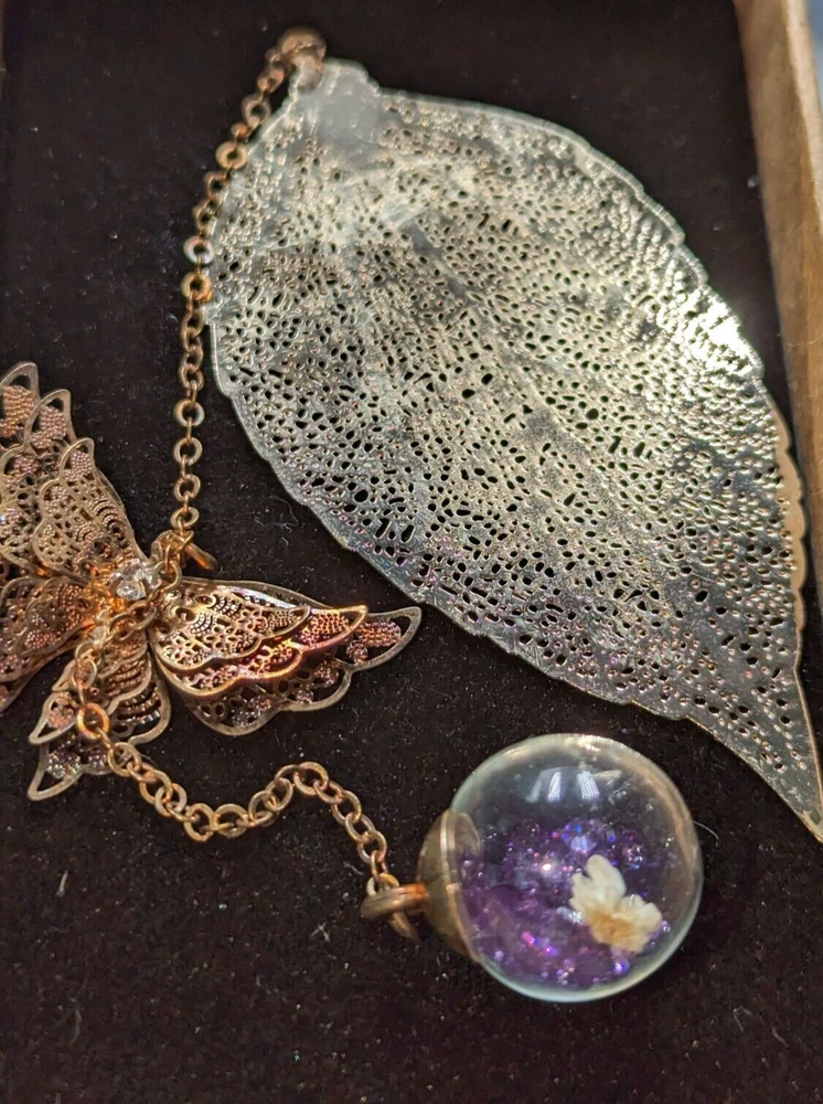 UPC: Does Not Apply Material: Metal Type: Bookmark Department: Women Color: Multicolor Seller Notes: “Pre-owned but I don't think this was ever used.” Pattern: Leaf Butterfly Country/Region of Manufacture: China Theme: Nature Brand: Unbranded gtin13: Does Not Apply Personalize: No