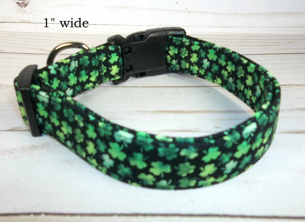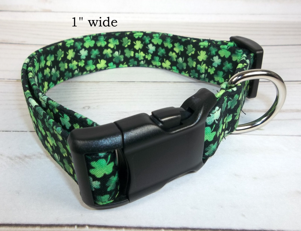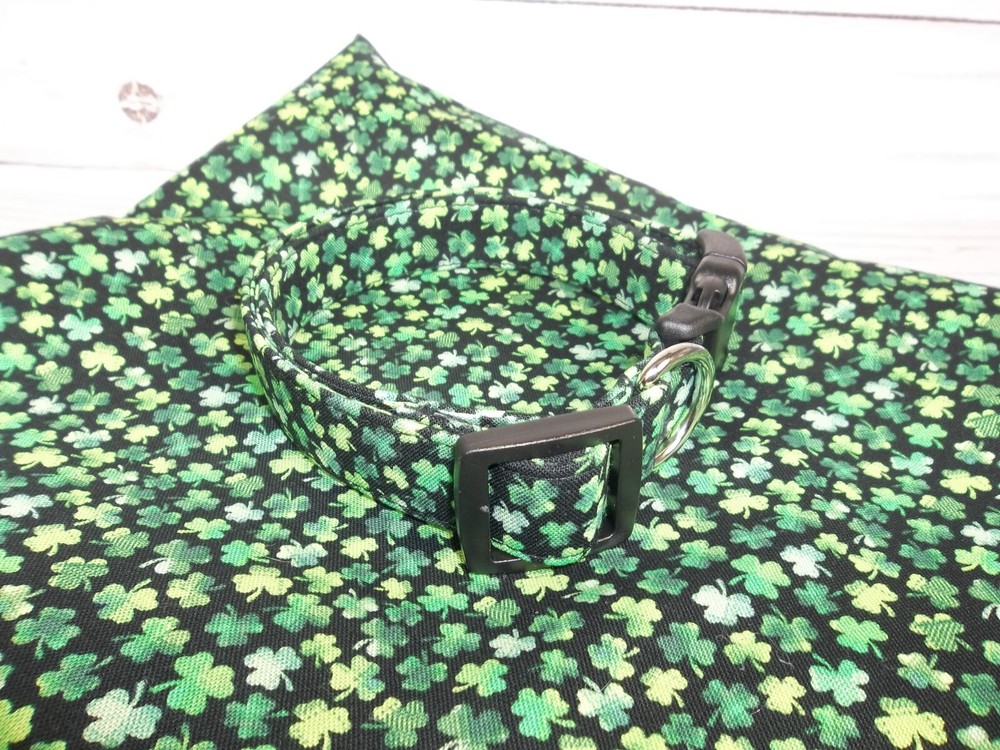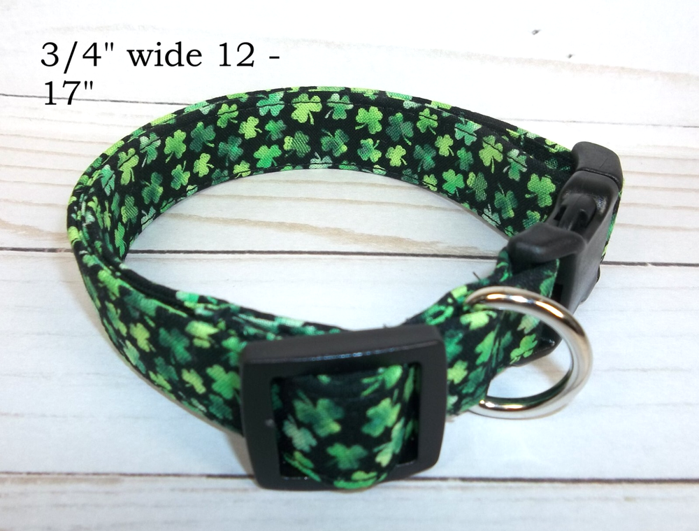 Green and Black Shamrock Dog Collar made by Terri's Dog Collars ♥ ♥ ♥ ♥ ♥ ♥ Each buy it now of this auction is for one handmade Terri's Dog Collar ~ size your choice Size: adjustable from 7 - 26" depending upon size chosen from the drop down menu Width: varies 5/8" wide 7 - 10" 5/8" wide 10 - 15 3/4" wide 10 - 15" 3/4" wide 12 - 17" 13 - 18" 1" wide 15 - 23" 1" wide 17 - 26" 1" wide 1.5" wide 15 - 23" 1.5" wide 17 - 26" Fabric: Green on black mini shamrocks Webbing: Poly Pro Buckle: Heavy Duty Contoured Plastic side release We take great pride and care in making our dog collars. We sew high quality fabric over a Poly pro webbing for durability and strength and yet a great weight on your dog's neck. We also use a heavy duty welded D-ring so that your dog can pull as much as he / she wants when walking and you'll still be safe. We use a heavy duty contoured side release buckle. The contour feels great on your dogs neck and the heavy duty stands up to lots and lots of wear. Before you order, you need to measure your dog's neck and make sure it will fit. Please e-mail me with questions or special orders to be listed on ebay for you Other Details : You will receive a collar like in the pictures. The collar in the picture is 1" wide large but has been adjusted to the smallest size of 17". Your collar will be made when you order. We are smoke free / cigarette free work space. However, we do have dogs and love them very much. ♥ ♥ ♥ ♥ ♥ ♥ We accept eBay payments at this time. If you need to change your shipping address, please do so BEFORE you make your payment. Also, please attach any information that you think we will need, to your payment in the comments section. ♥ ♥ ♥ ♥ ♥ ♥ Shipping by first class mail with delivery confirmation: $4.75 We do combine shipping We ship Monday - Friday and will ship most orders within 2 business days (not calendar days) ♥ ♥ ♥ ♥ ♥ ♥ Thank you !!! Thank you for taking time to visit our auction and store. Happy eBaying !! Model NOT included: She just likes showing off her custom made collars !!!!