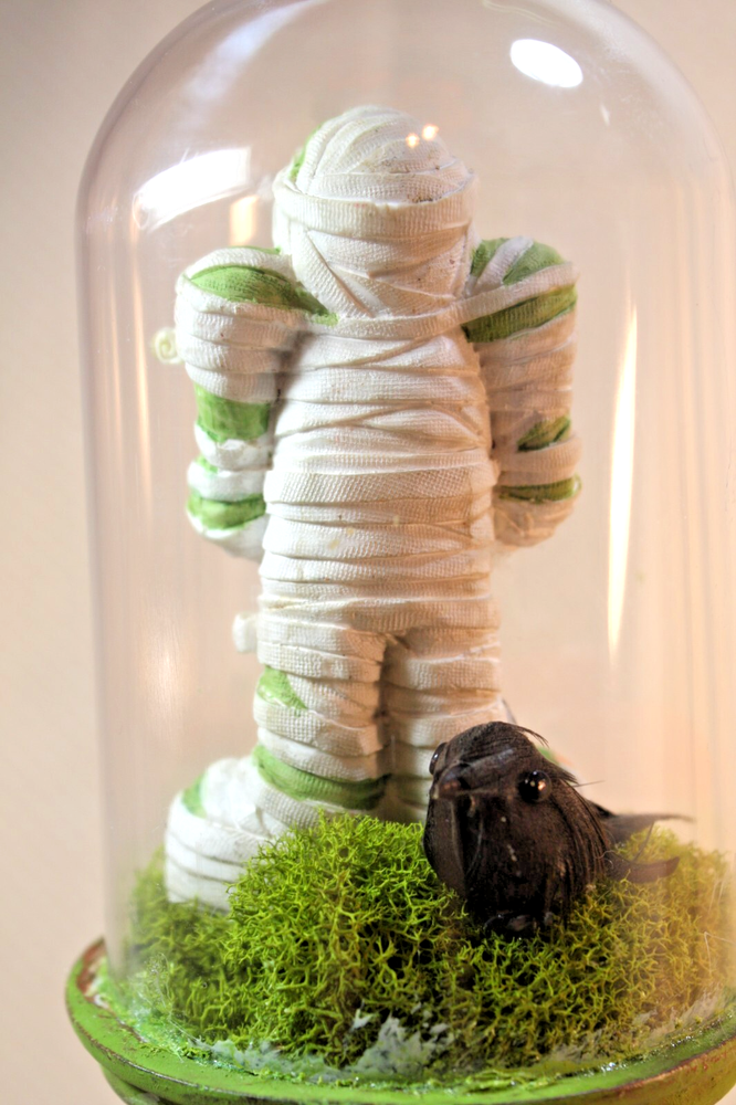 This handmade Halloween cloche on a pedestal features a cute Frankenstein monster mummy with several smiling pumpkins, perfect for adding a festive touch to your home decor. The figurine stands at 12.5 inches tall, with a creepy style and clear glass finish that adds to its appeal. The green color and detailed design make it a unique and eye-catching piece for celebrating Halloween in style.