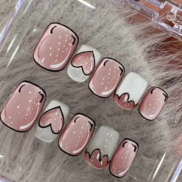 Handmade Heart Pink Shimmer False Nail Short Coffin Press on Nail for Nail Art